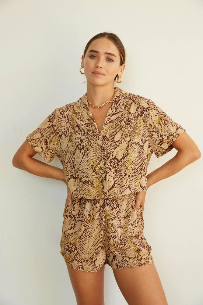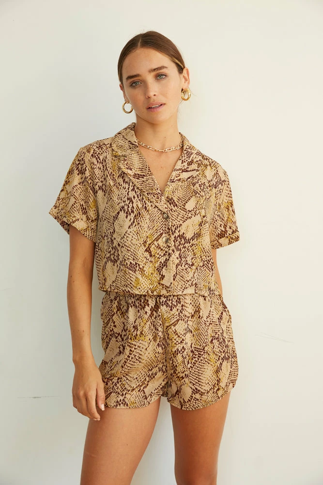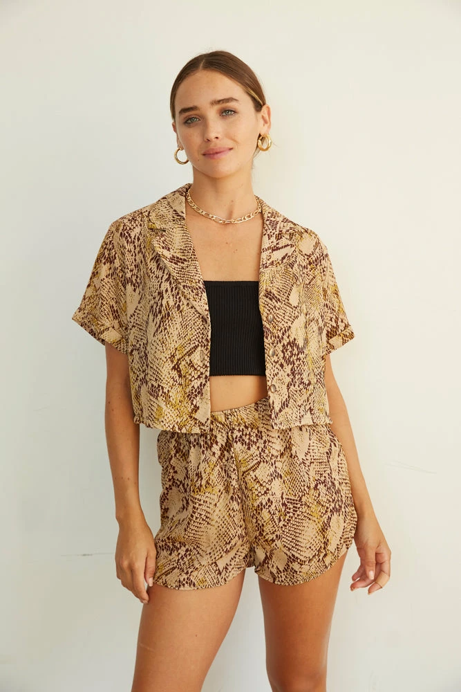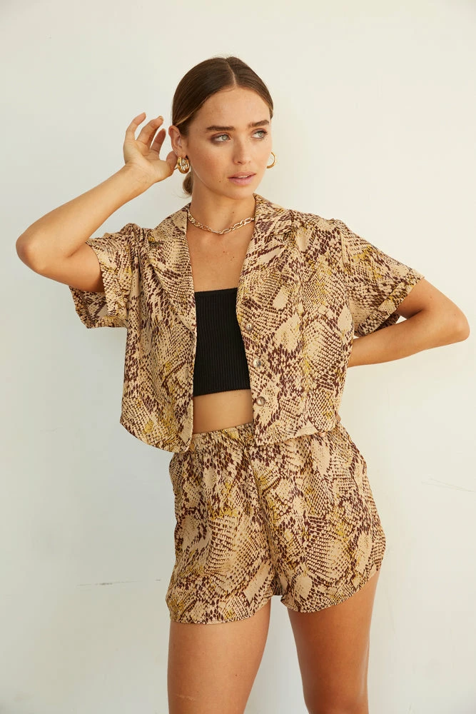 Hey babe, fall in love with our Wild Ways Snakeskin Shorts. Featuring a high rise fit with an elastic waist for a perfect fit. Available in a beige snakeskin print. Pair with our Venice Snakeskin Button Up Shirt to make this look a set.