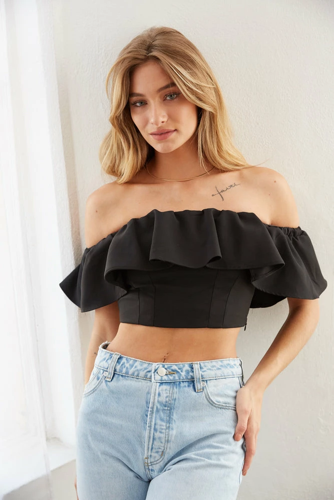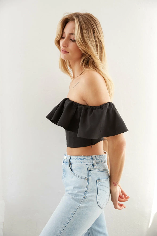 Lookin’ cute in the Sofie Ruffle Crop Top! This black crop top features a straight across neckline and flouncy off the shoulder ruffle sleeves. Pair with denim for a casual look!