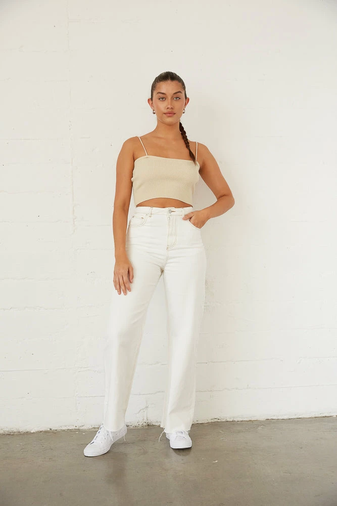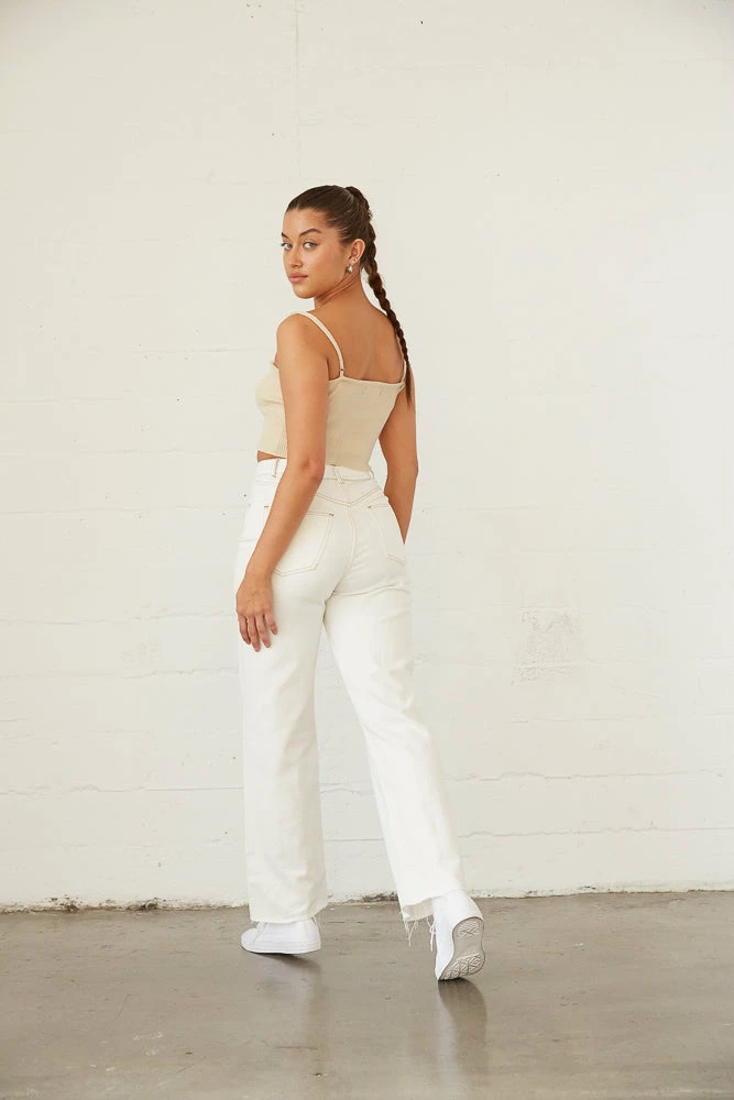 All you need is the Spencer Baggy Straight Jeans! These essential denim pants are complete with a relaxed wide leg silhouette, raw distressed hem, and a high rise fit to match any outfit. Available in white denim with beige stitching. Pair with a dreamy blouse for the perfect fall ‘fit!