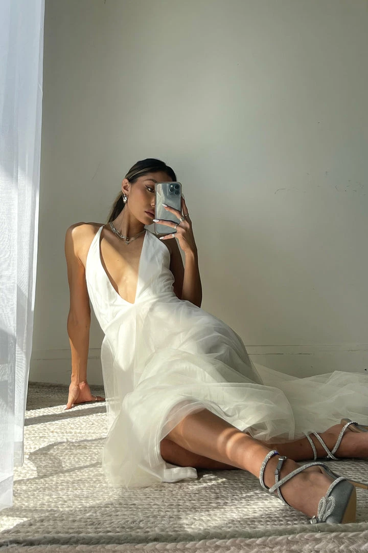Feelin’ like magic in the Vanessa Tulle Midi Dress! Featuring a v neckline, adjustable beaded tie straps for an open back design, and a flouncy tulle silhouette for a dreamy final touch! Available in blue and white. Pair with the Urson Tall Western Boots in White to complete the look!