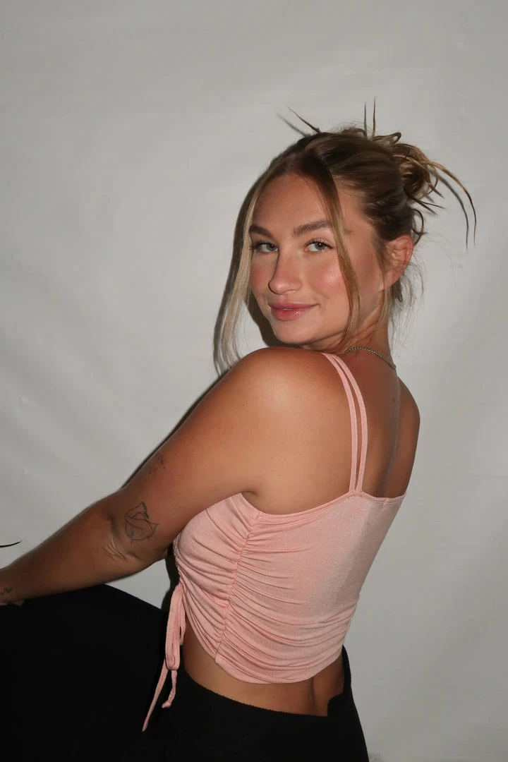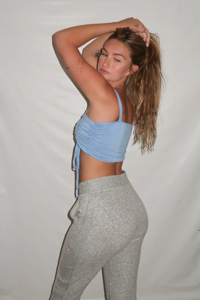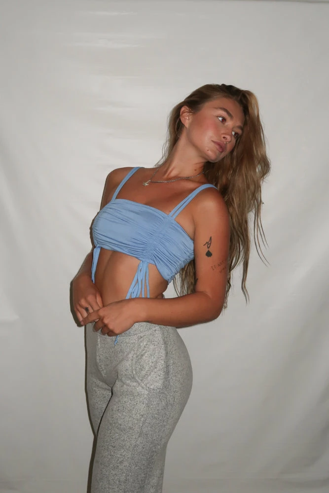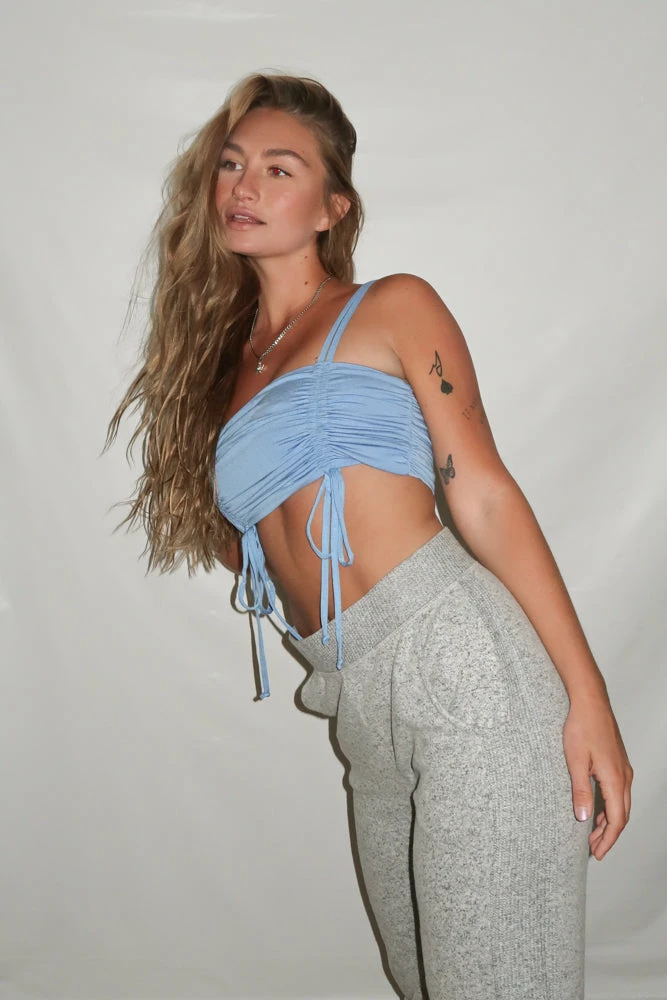 Stay cozy + cute in the Waking Up Cinched Crop Tank. Featuring a fitted cropped silhouette, double spaghetti straps, and two cinched tie details. Available in blue, pink, and black. Complete the look with our Kayla Jogger Pants.