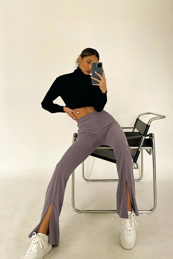 Transition to fall with the cutest closet staple– the Winter Ribbed Flare Leggings! These pants feature a soft ribbed design, a high rise yoga pant silhouette, and a flared leg with a split hem for a trendy look. Available in black, beige and purple. Top off your look with a vintage tee for a casual chic vibe.