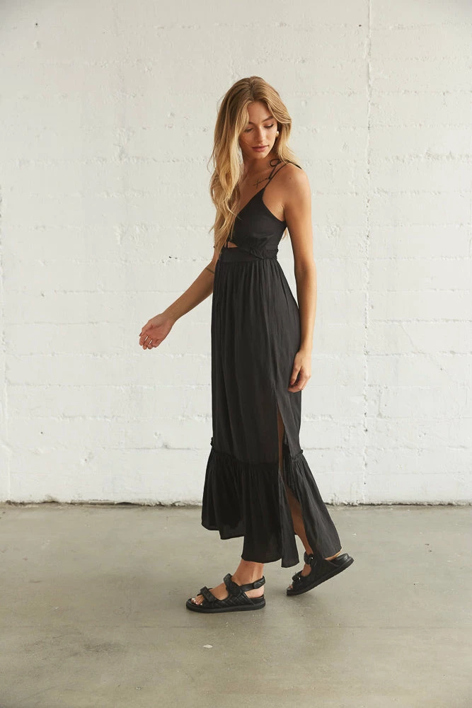 Cool as a breeze in the Yolanda Tiered Maxi Dress! Featuring a v neckline with a tie cut out detail, adjustable tie straps, a smocked waist for a cinched look, a side slit for a glimpse of leg, and a relaxed tiered ruffle silhouette. Available in black. Step into the Yanti Double Strap Block Heel in Black for a dreamy monochromatic look!
