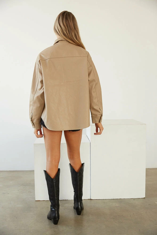 Always a vibe in the Atlantic Vegan Leather Shacket! Featuring a collared neckline, a button up front, two front pockets, and a relaxed pleather silhouette for a chic look. Style this piece as a shirt or as a jacket! Available in beige. Pair with the Clover Wide Leg Trousers.