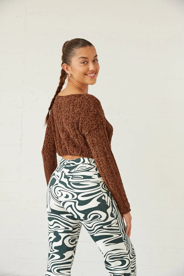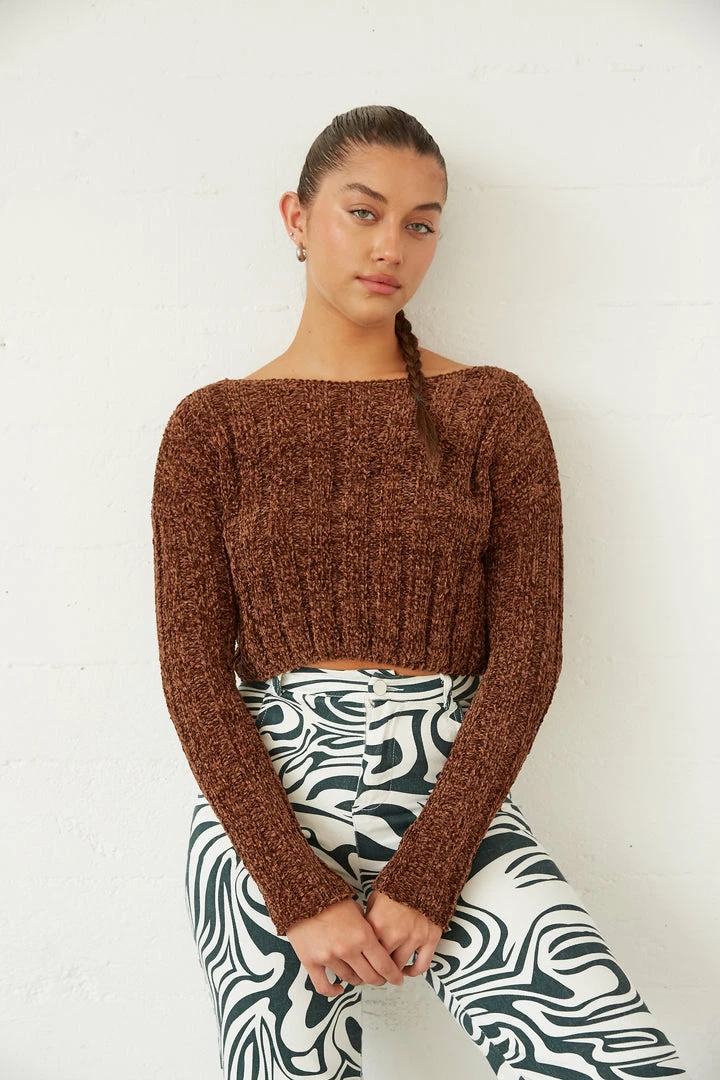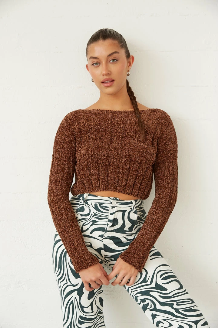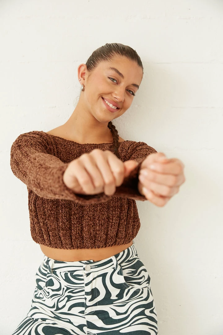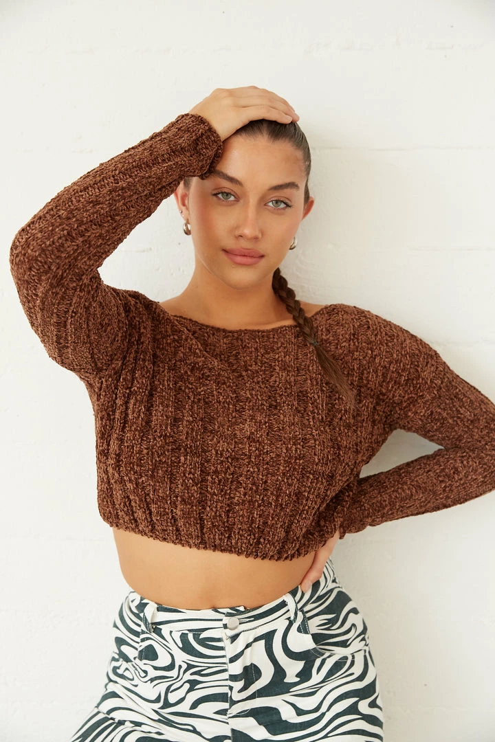 Lookin’ cute in the Avery Knit Crop Sweater! Featuring a crew neckline and an ultra soft chenille knitted design. Available in brown.