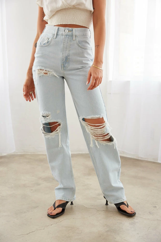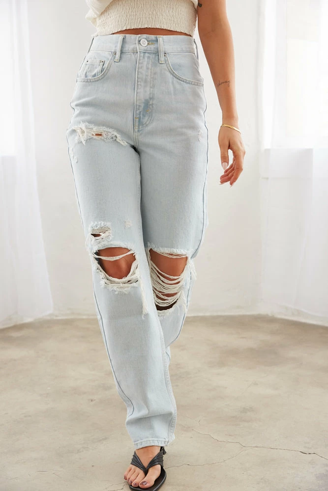 Hey babe, meet your new favorite jeans! The Alex Distressed Baggy Boyfriend Jeans are complete with a relaxed straight silhouette, distressed detailing throughout, and a high rise fit. Available in light wash denim. Pair with the Maldives Ruched Heeled Mule for the ultimate model off duty look!Â