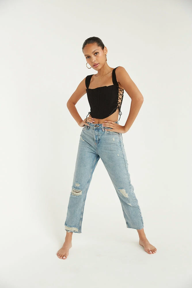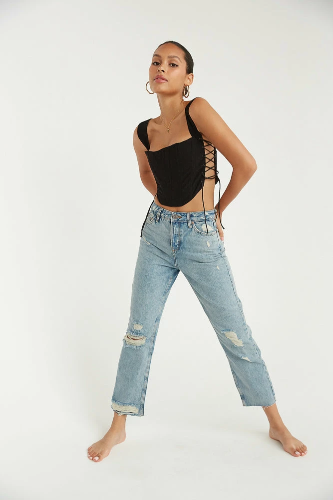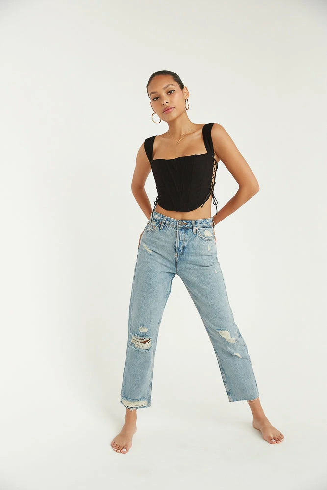 Hey babe, the Destroyed Ripped Pax Jeans by BDG are the perfect way to add some edge to your ‘fit! Featuring a high rise fit, a faux rip at the butt, distressed detailing throughout, raw hem, and a cropped straight leg. Available in light vintage washed denim. Pair with the Kiko Corset Crop Top for a flirty summer vibe!
