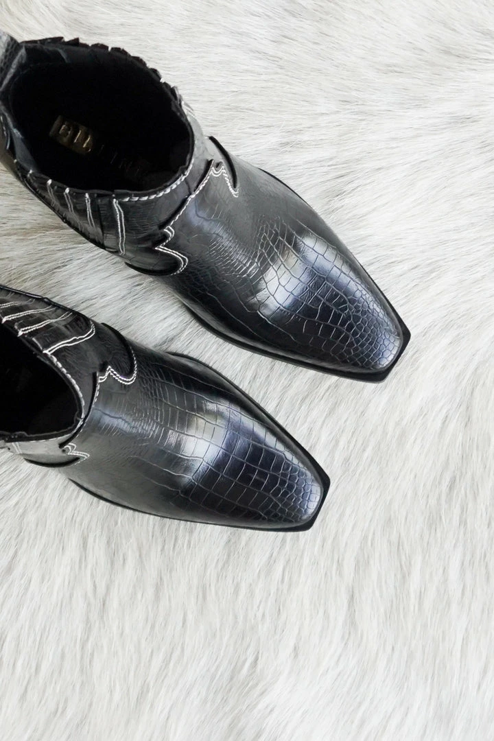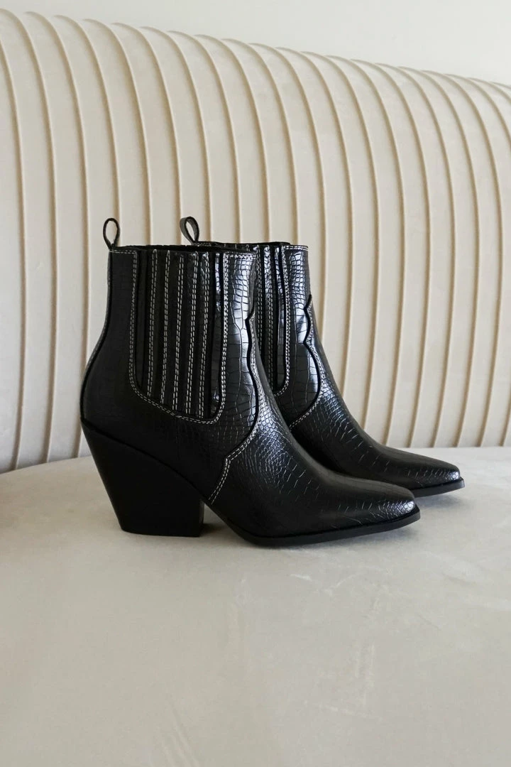 Camille by Billini is a western style mid ankle boot. Make a statement this season with this detailed western-inspired mid ankle boot, best paired with baggy jeans or mini skirt. Available in Black. Pair with our Courtney Tie Back Babydoll Dress