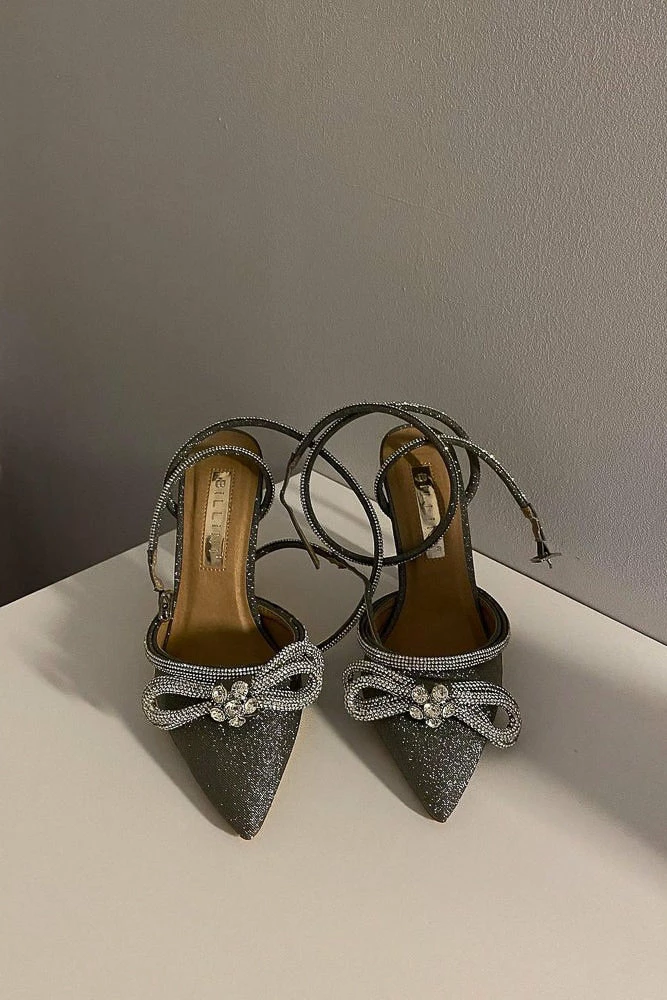 The Elope Rhinestone Heel by Billini is the ultimate statement heel! This luxe pointed pump features a crystal bow embellishment with large diamante detail at the toe, wrap around ankle straps, diamante encrusted detailing, and a luxe finish to make this heel the stand out choice for your next evening or bridal look. Pair these sparkly shoes with your favorite dress. Also available in Black Satin.