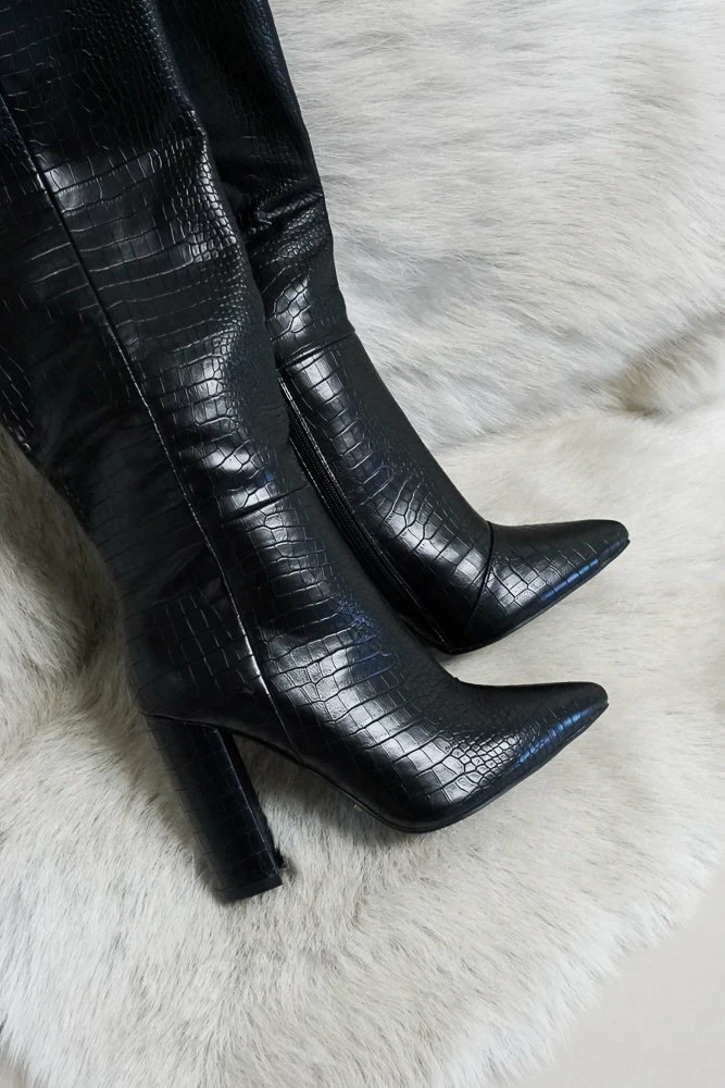 Milla by Billini is a statement long boot. Finished in a luxe croc look, this long boot will elevate your winter wardrobe. Available in Black. Pair with our Cassie Metallic Mini Dress for a fierce look.