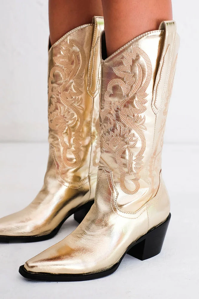 Add a touch of western inspired styling to your off-duty look with Danilo. Danilo by Billini is a long, western boot. Featuring a gorgeous shiny gold metallic finish. For events, festivals and beyond, this classic western boot is a must-have this season. Pair with a cute dress for a complete game day look!