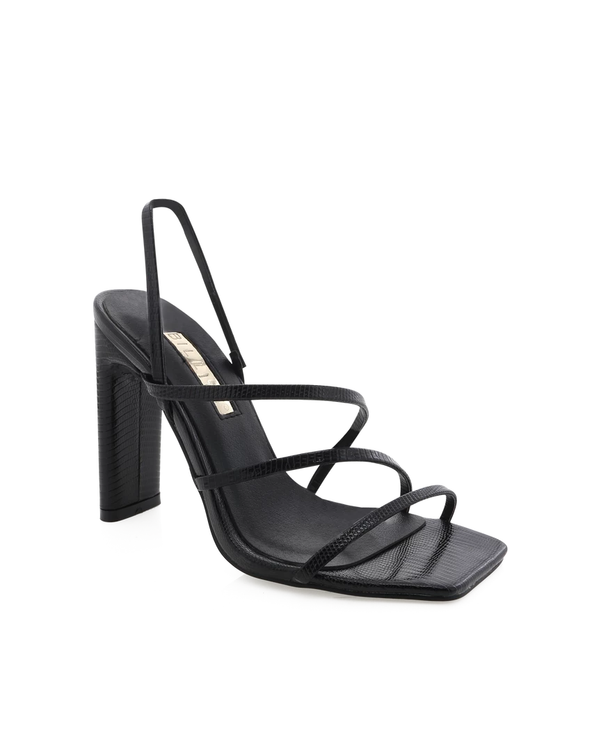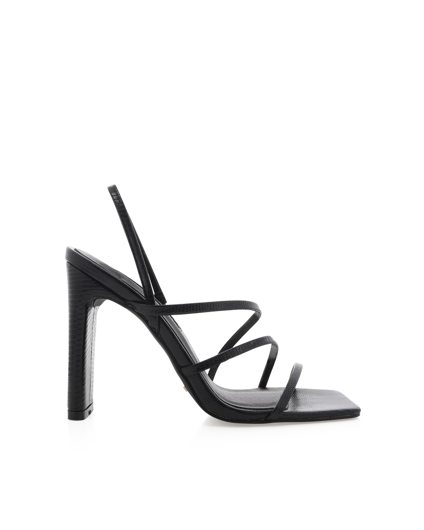 Add some edge to your look with the Cass Strappy Heel by Billini! These croc embossed heels feature thin crossover straps, an open toe design, and contemporary silhouette. Available in black scale. Pair this with the Tatiana Satin Mini Dress for a monochromatic look.