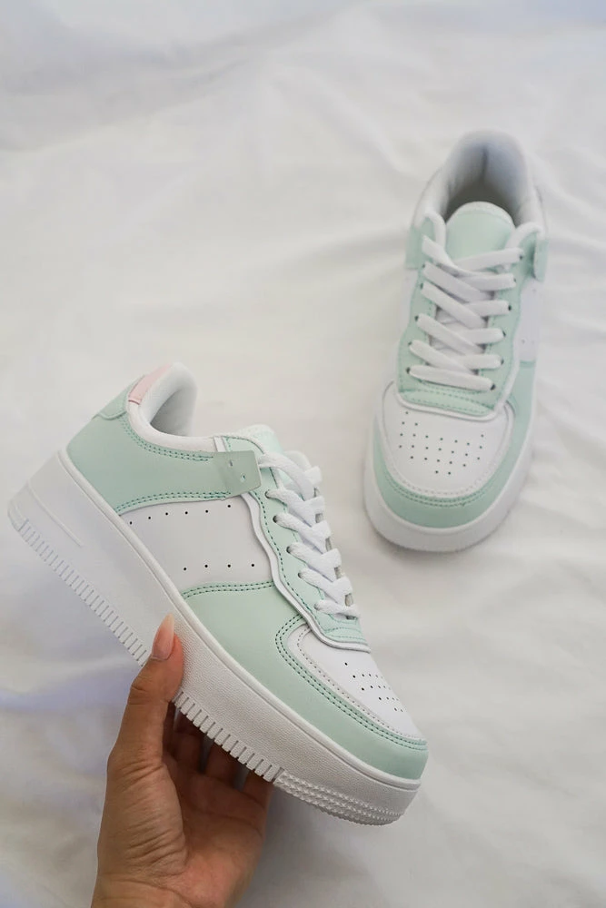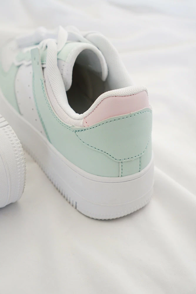 The Dixie Lace Up Platform Sneaker is the perfect pair for your next athleisure look! Featuring a platform sole, lace up construction, and two tone design. Available in mint and pink vegan leather.