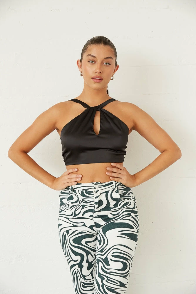 Stay wild in the Encinitas Satin Crop Top! This chic wardrobe staple is complete with a twist halter neckline with a keyhole cut out detail, a fitted silhouette, and an open back design. Available in black and pink. Pair with the Ramona Wavy Straight Leg Jeans in Teal for a funky finish!