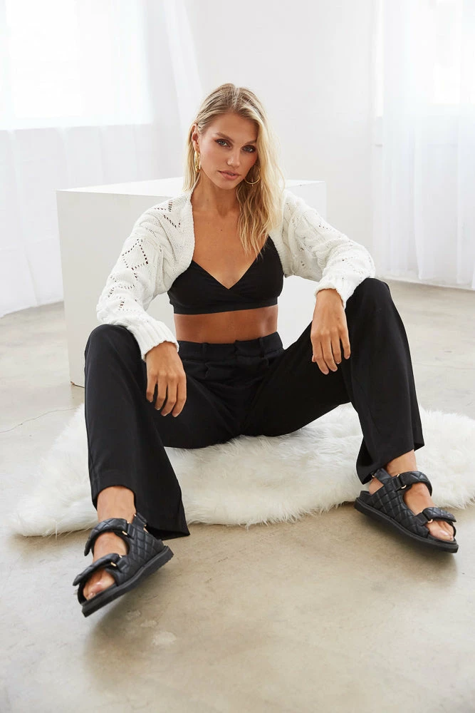 So soft and sweet in the Jada Knit Bolero Sweater! Featuring a soft cable knit design and an extra cropped cardigan silhouette to layer over your favorite top. Available in white. Style with some denim for a laid back look.Â