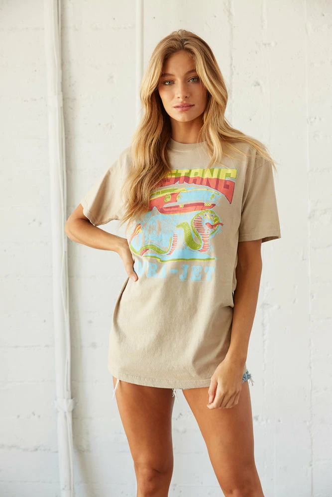 Hey vintage babe! The Mustang Cobra Jet Tee is the perfect piece to add some edge to your favorite fit. Featuring a boxy relaxed silhouette and a colorful front “Mustang Cobra-Jet” graphic. Available in beige. Style with the Dusters Short In Layla Bleach for a total retro vibe.