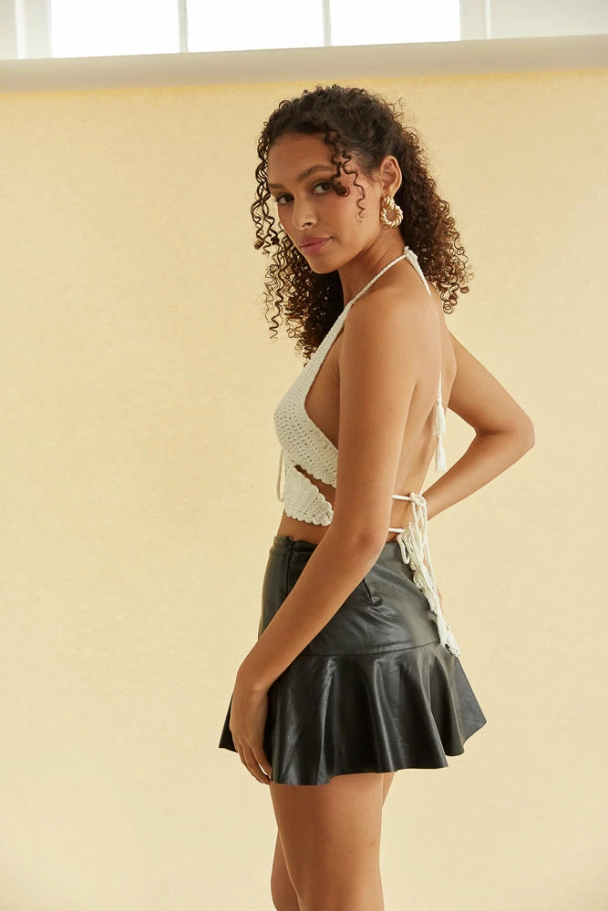 Melting hearts in the Kat Vegan Leather Mini Skirt! This flirty piece is complete with a high rise fit, a flouncy silhouette, and a faux leather design for a chic final touch. Available in black and cream. Pair with the Indio Crochet Halter Top for a party ready look.