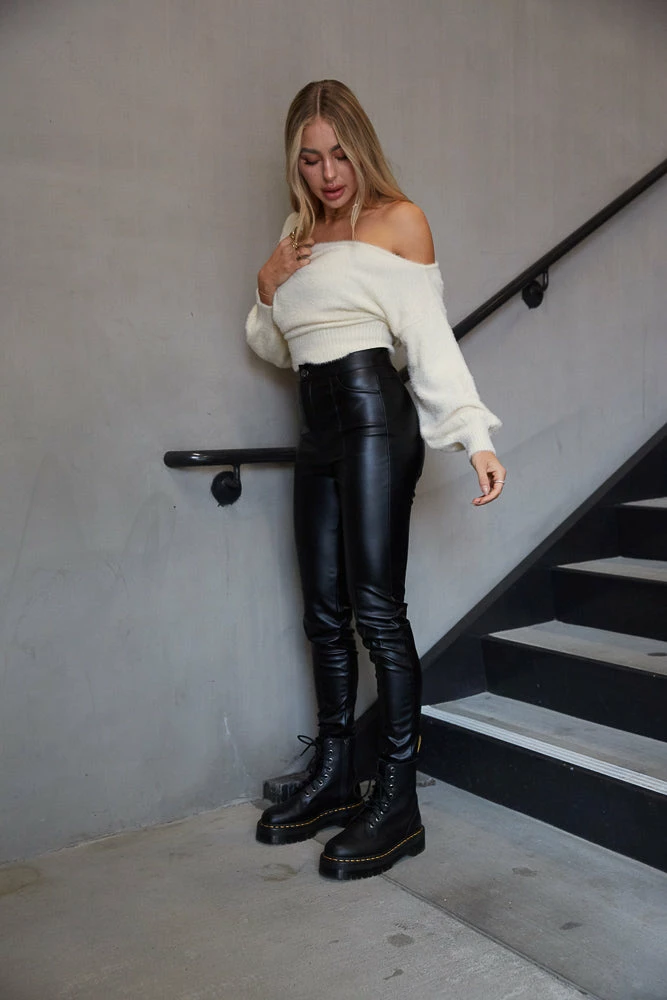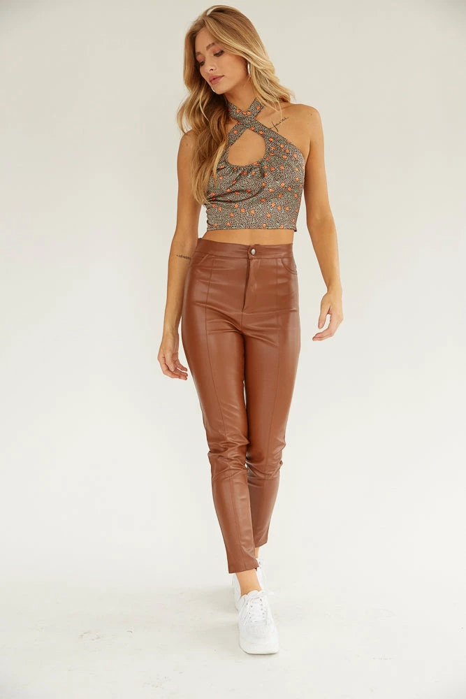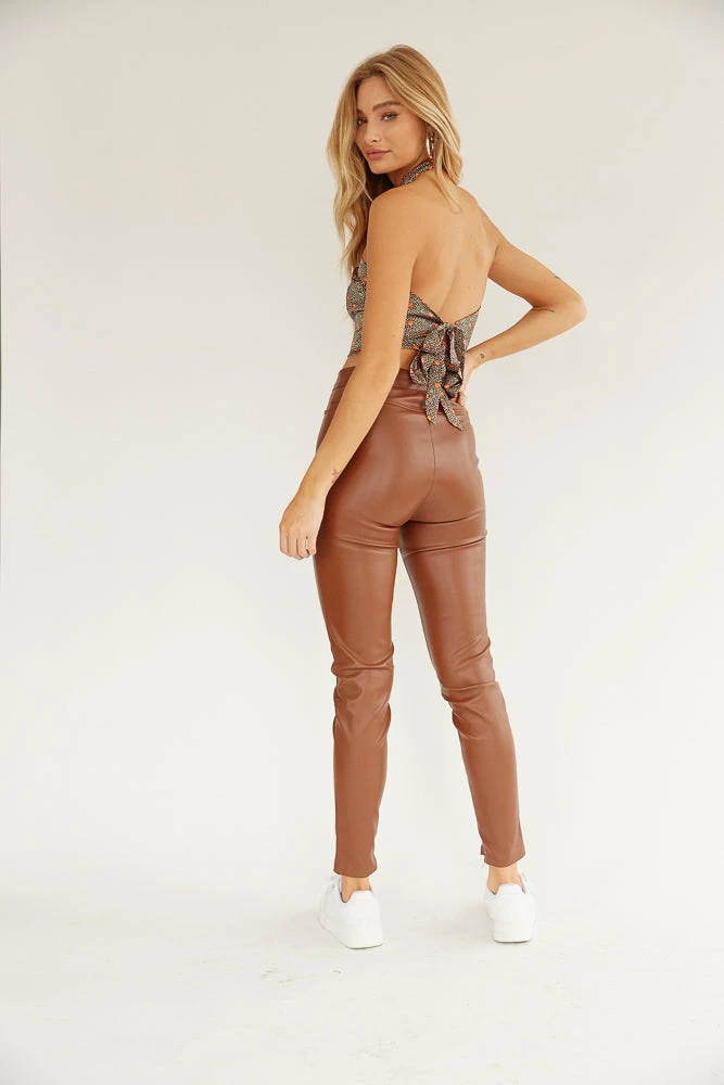 Hey babe, the Kenny Vegan Leather Pants are the perfect piece for your wardrobe! These chic faux leather leggings are complete with a high rise fit, a slim fit leg, and a front seam detail down the leg for an edgy finish. Available in brown. Pair with the Lucille Floral Halter Crop Top for a feminine final touch.