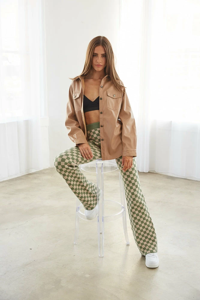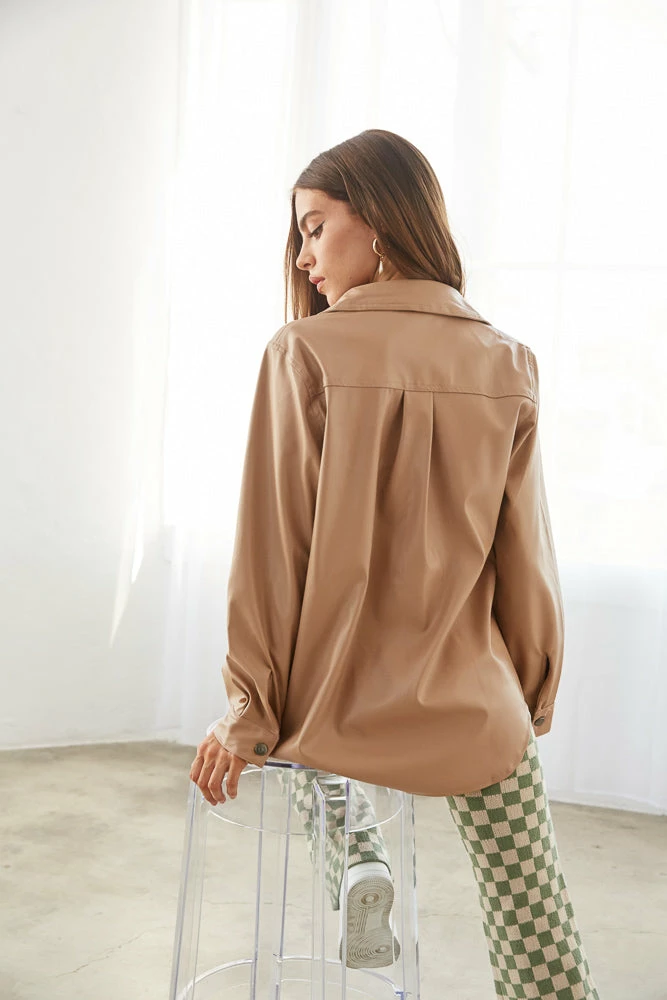 Babe, meet your new fall favorite: The Knox Vegan Leather Jacket! This trendy layering piece is complete with a button up front, two front pocket details, a lightweight faux leather material, and a relaxed fit. Available in tan. Layer over the Isadora Halter Mini Dress for a perfect fall look.