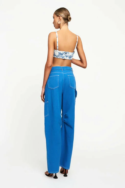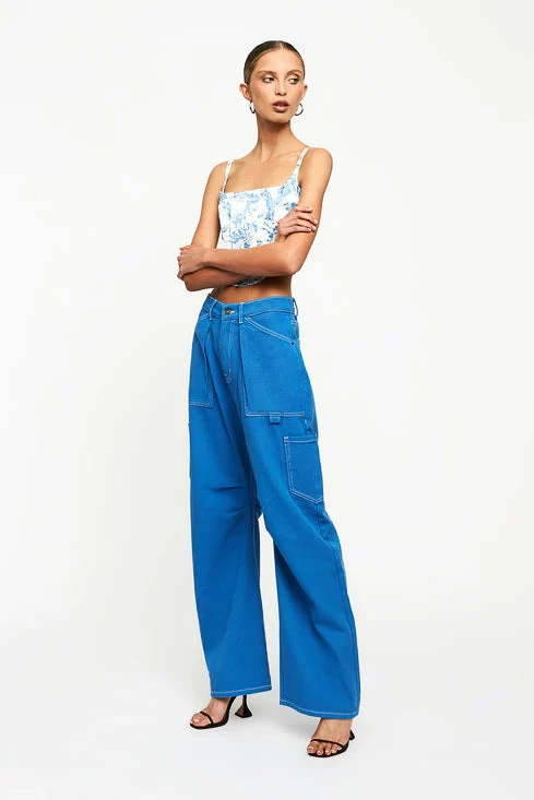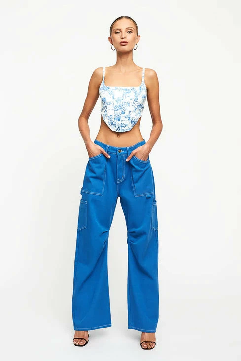 Hey babe, beat the summertime blues in this silky satin corset. The Lioness Tanis Corset in Blue Porcelain features a delft blue pattern, cropped silhouette with a straight across neckline, and inner boning for a structured look. Go for a 90s vibe with the Miami Vice Pant in Blue.