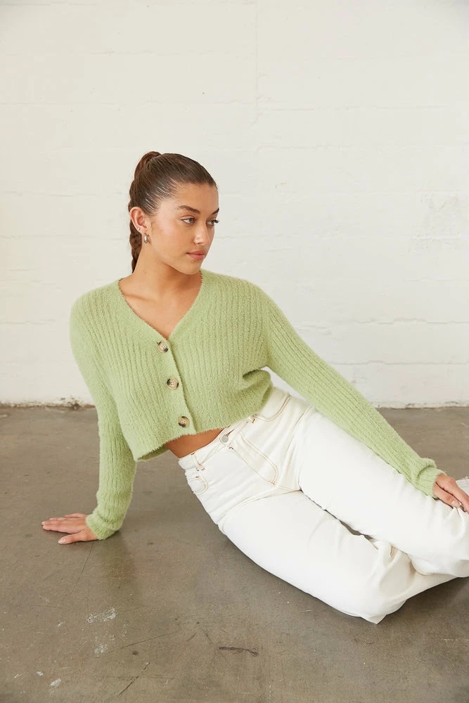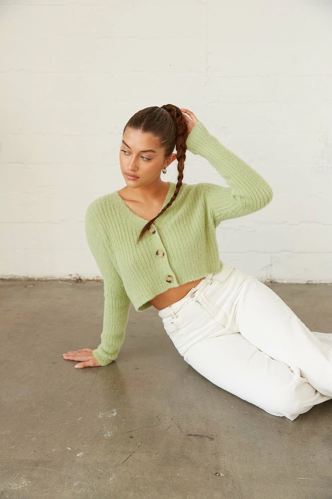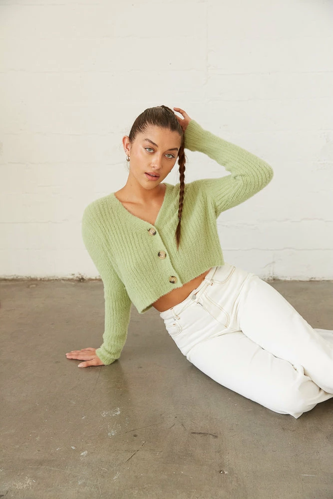 Hey babe, meet the Marina Crop Cardigan Sweater! This cozy piece is complete with a v neckline, button up front, and an ultra soft fuzzy knit bodice. Available in green. Keep it casual with the Spencer Baggy Straight Jeans!Â