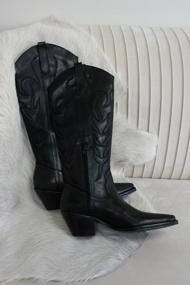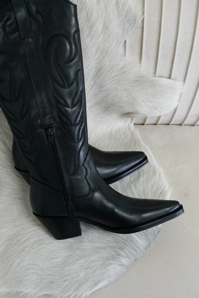 Agency by Matisse is a black western boot. Make a statement this season with this highly-detailed western-inspired long boot, best paired with baggy jeans or mini skirt. Available in Black. Pair with our Emmaline Satin Mini Dress