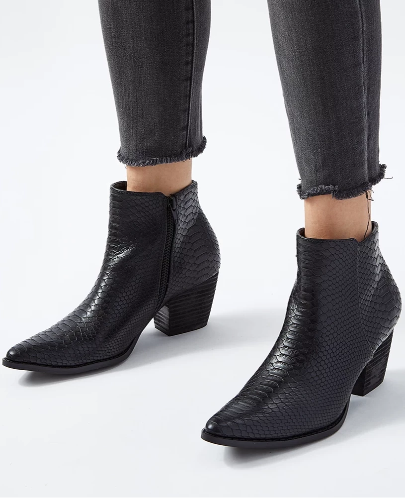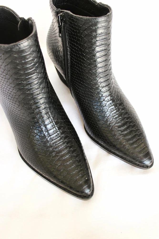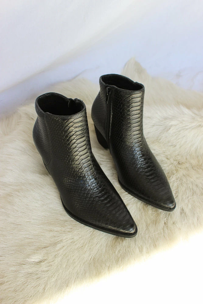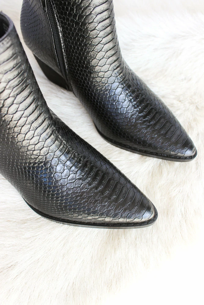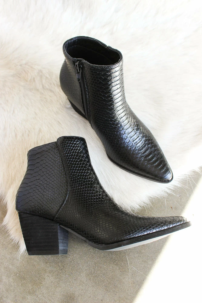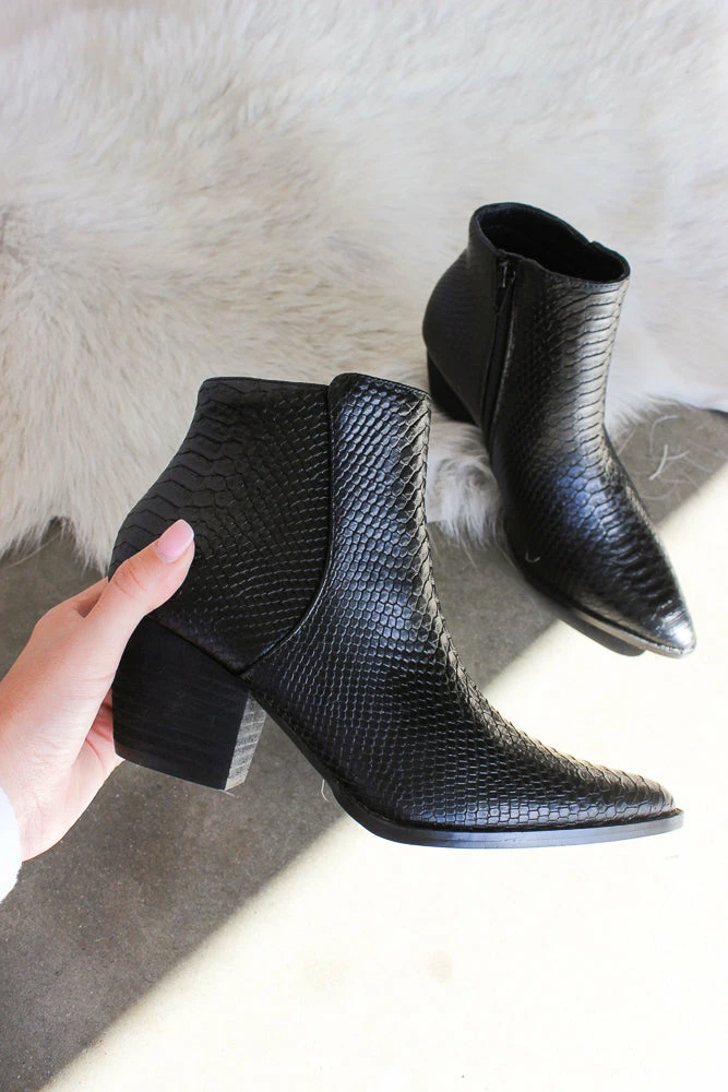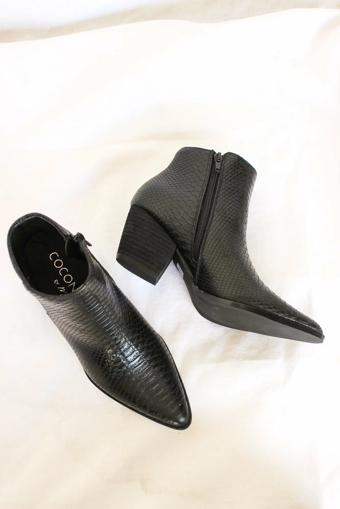 The Astoria ankle bootie includes a raw leather stacked heel and padded insole offering comfort for day long wear. Available in black with a snake textured design. Coconuts by Matisse.Ā