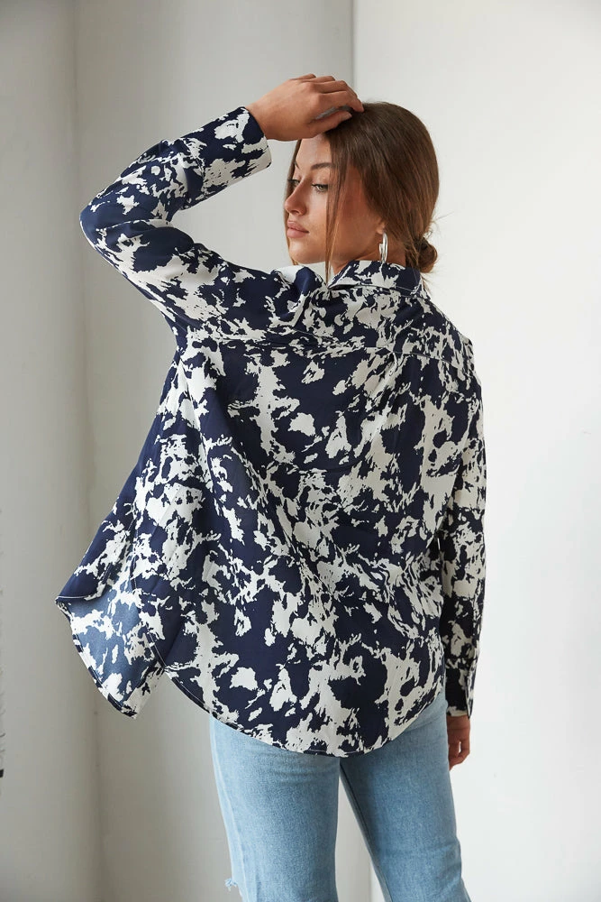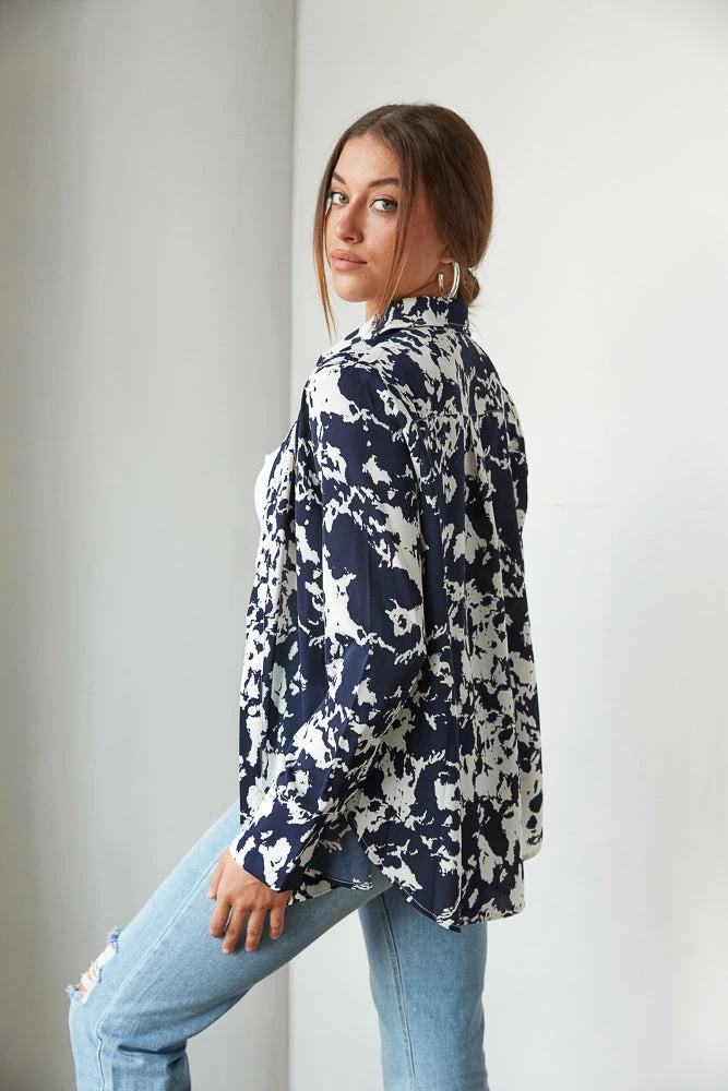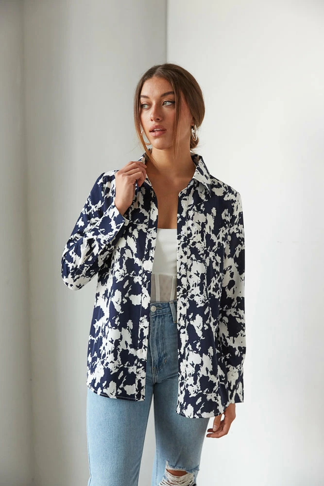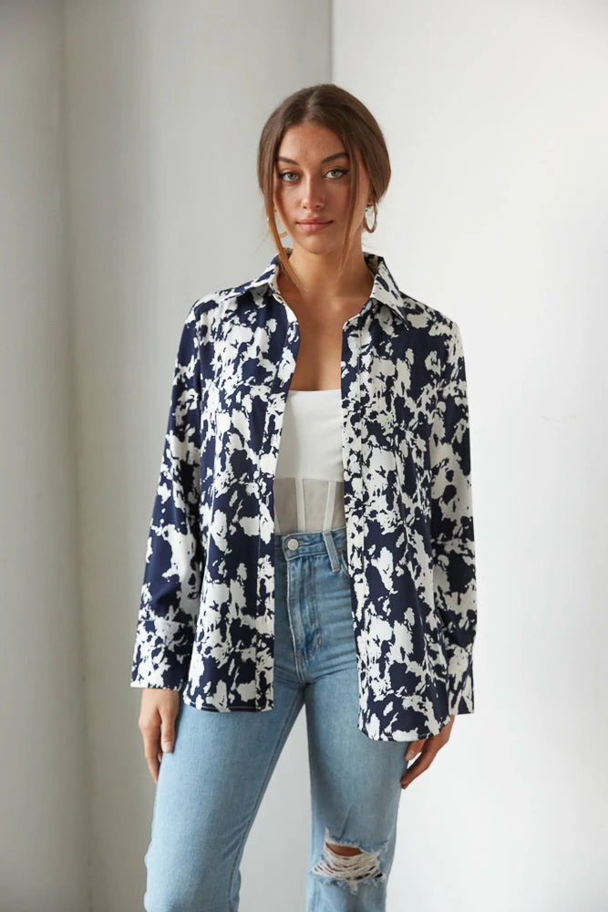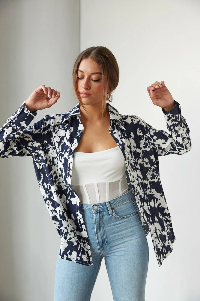 Hey babe, the Lively Printed Button Up is the perfect piece to jazz up your wardrobe! Featuring a button up front and a bold splatter print throughout. Available in a navy blue and white print. Wear alone, or throw it on over the Natalia Mesh Bustier Crop Top for a chic fall statement!