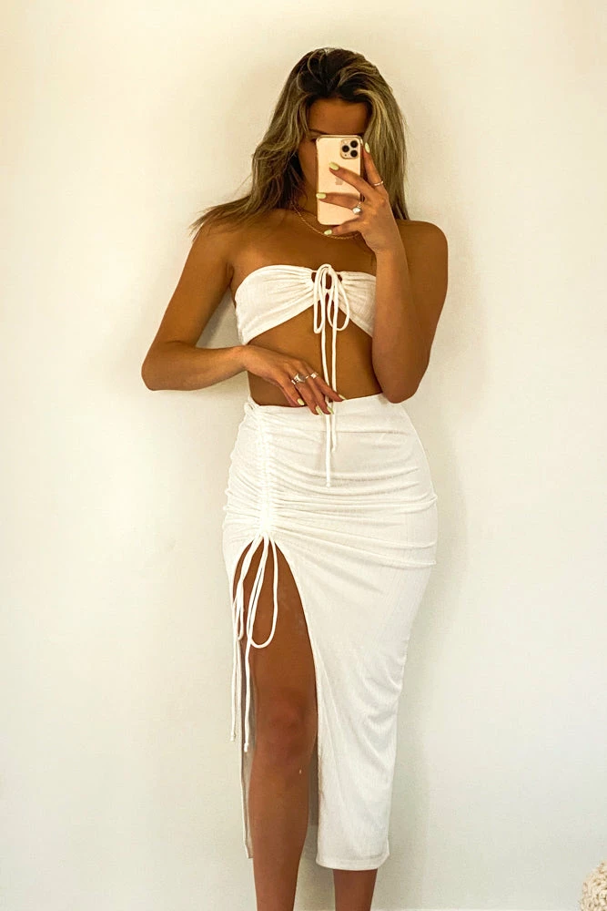 The perfect vacay look just landed in the Playa Midi Skirt Set! This must-have set for the summer features a ribbed halter crop top and a ribbed midi length skirt with side cinched detailing. Available in white and brick. Pair with the Five And Two Jagger Necklace to finish off the look!
