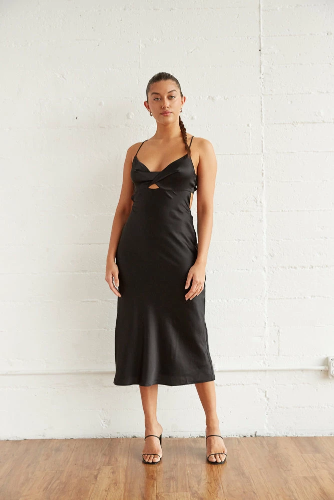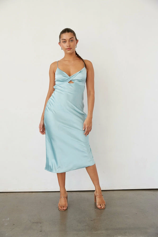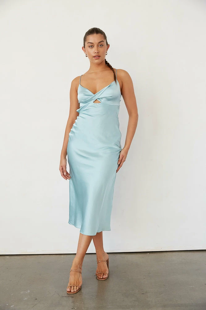 Hey dream girl, meet the Genesis Satin Midi Dress! Featuring a twist sweetheart neckline with a cutout detail, a flattering silhouette, and an open racer back design. Available in aqua blue and black. Live out your dreams by pairing this with one of our beautiful pair of heels!