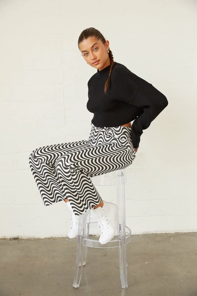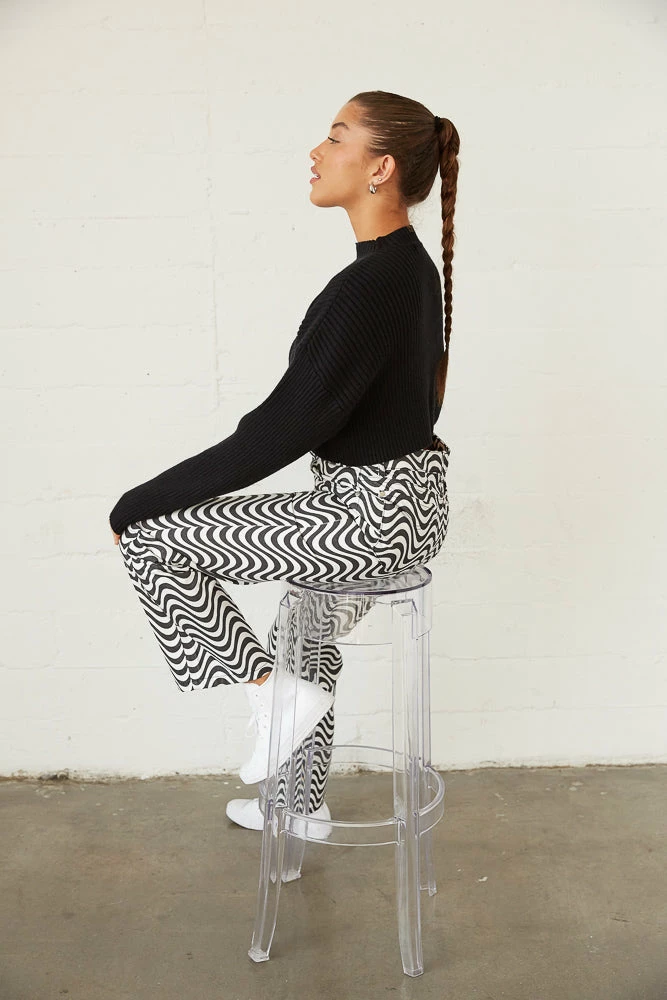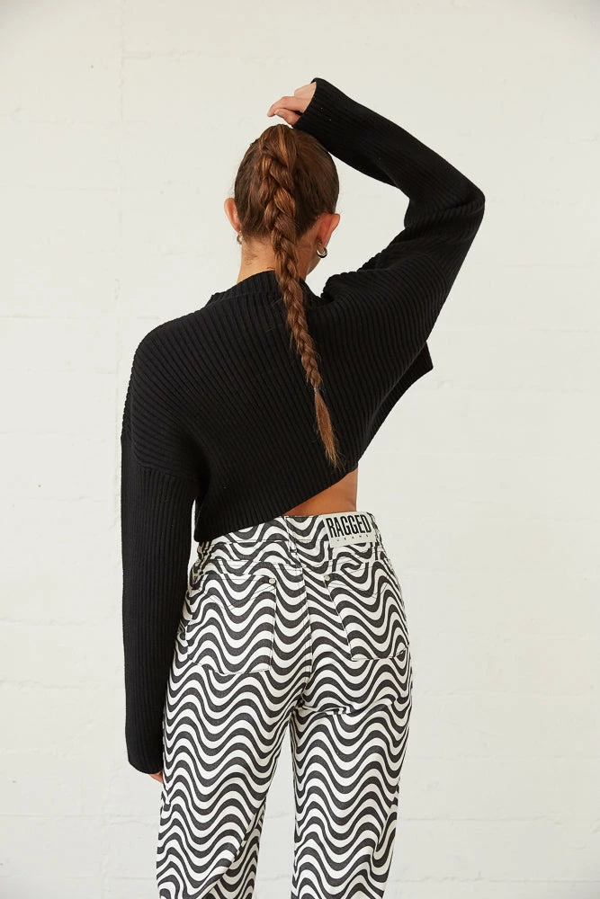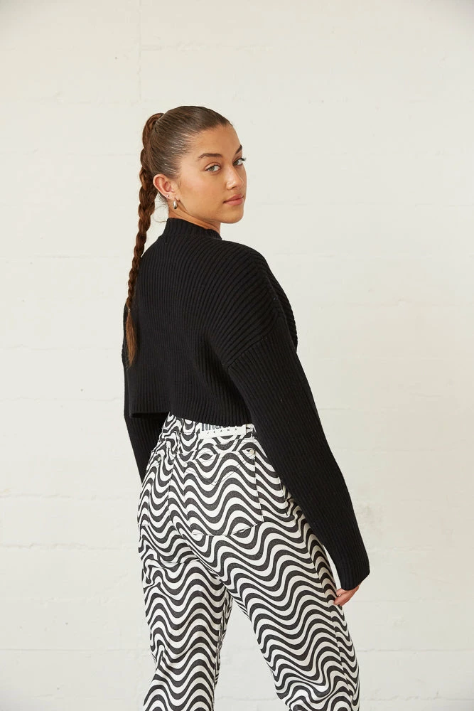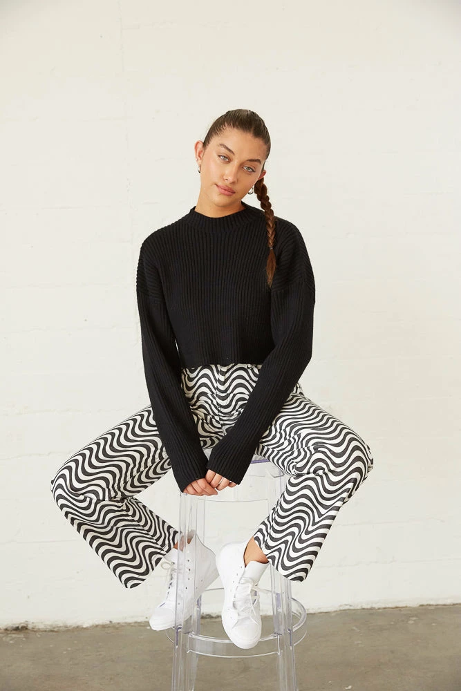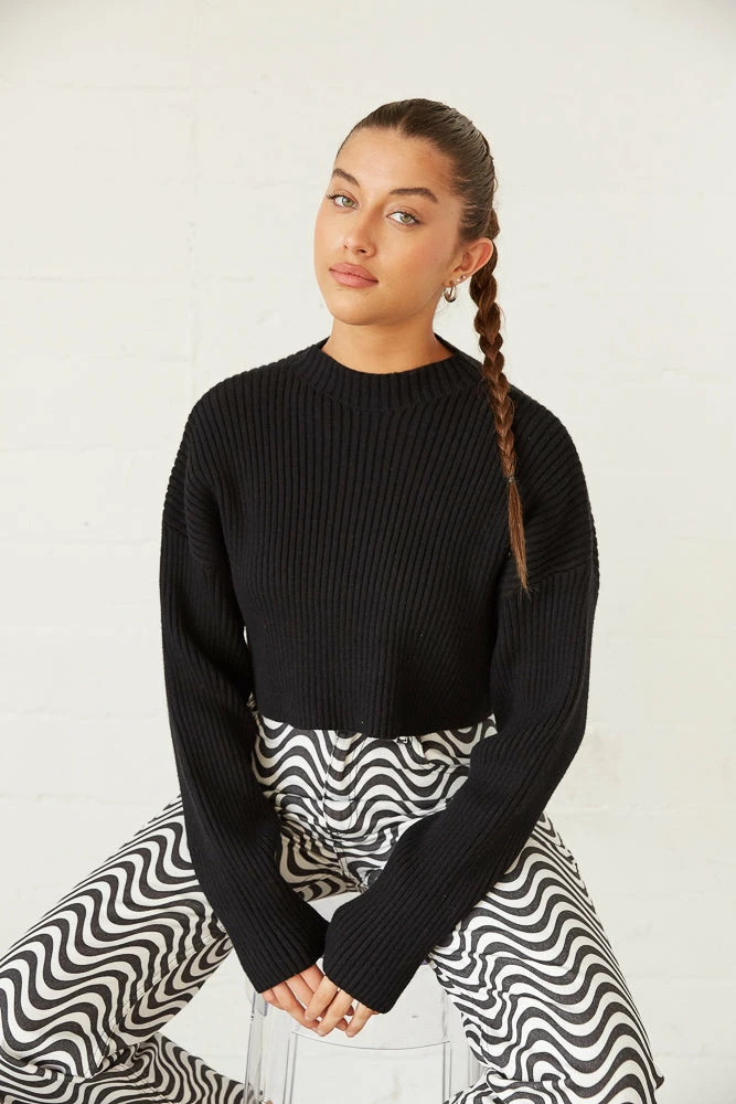 So cozy in the Lizzie Knit Crop Sweater! Featuring a mock neckline, a soft rib knitted design, and a dropped shoulder for a relaxed fit. Available in black. Style with the Jett Cut Out Flare Jeans for a chic monochromatic look!