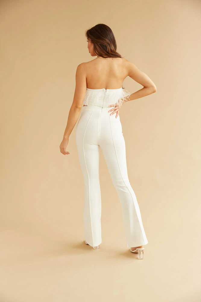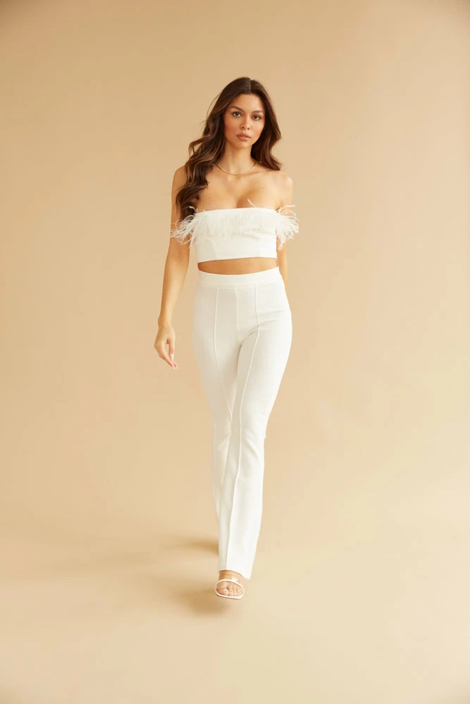 Hey angel, you need the Rosie Faux Feather Tube Top. This cropped white strapless top features faux feather trim. Complete the dreamy look with the Rosie High Waisted Flare Trousers and the Ukari Clear Block Heel.