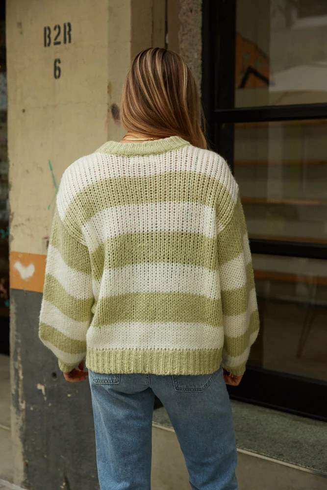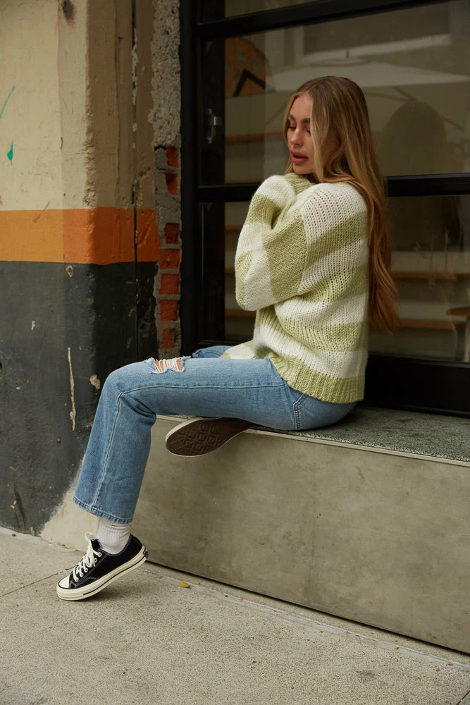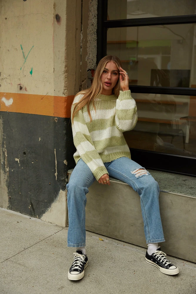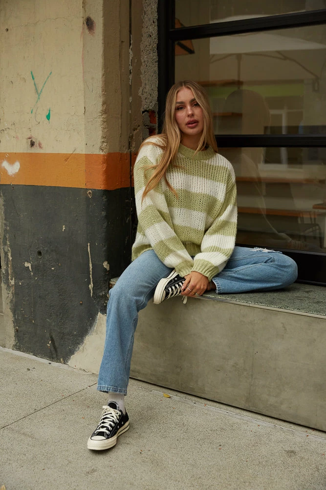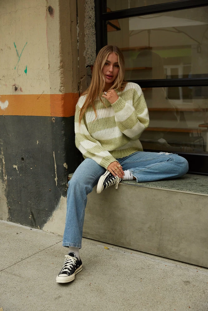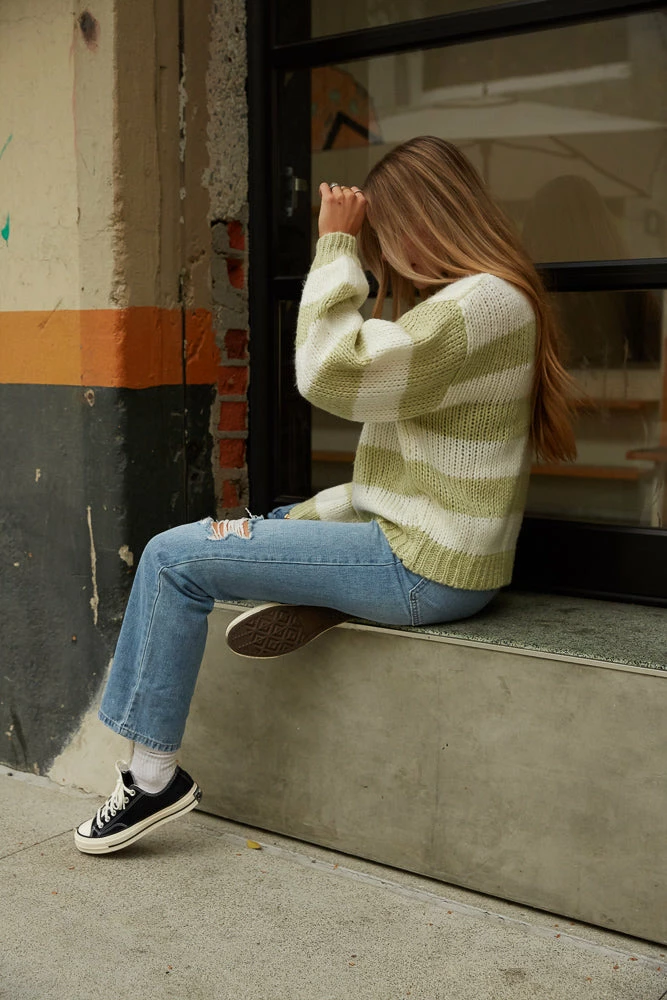 The best time to wear a striped sweater is ALL the time! The Pacific Stripe Knit Sweater is the coziest piece to dress up or down. Featuring a crew neckline, a knitted striped design, and a relaxed silhouette. Available in green and cream. Pair with the Hudson Distressed Straight Jeans for a cute and casual vibe!