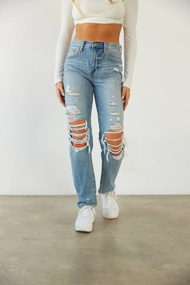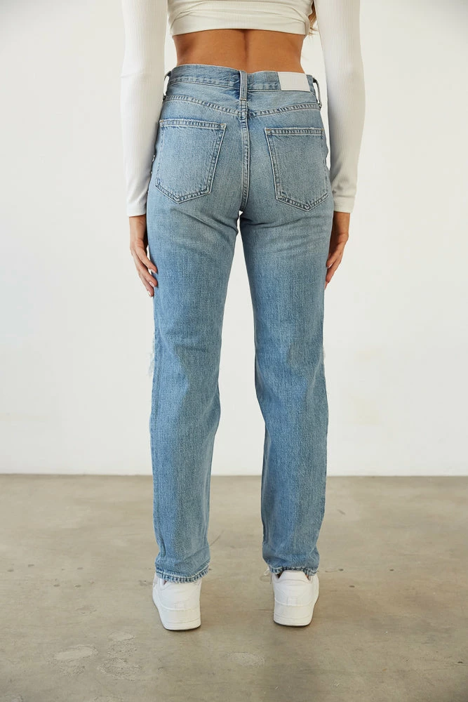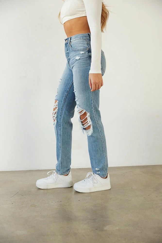 These high rise vintage-inspired jeans by Pistola are a MUST. Featuring rips + distressed detailing throughout, a relaxed skinny fit, and a faded blue wash. Pair with Ellie Ribbed Tank for the perfect weekend vibe!Â