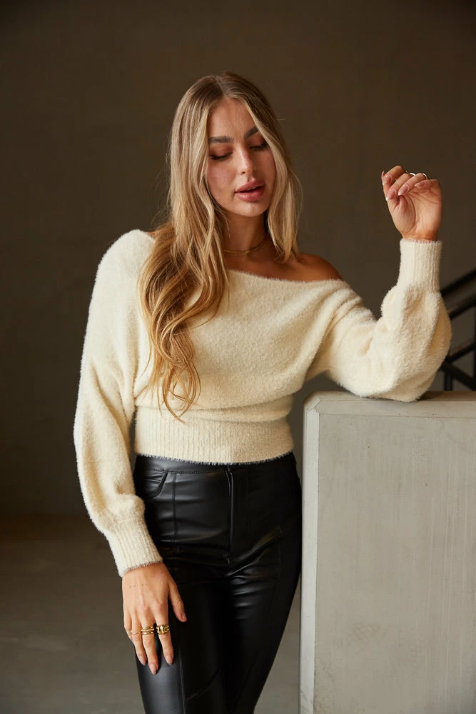 Cozy meets chic in the Presley Fuzzy Sweater Top! This off the shoulder sweater is complete with an asymmetrical neckline, puff sleeves, a fitted waist, and a soft fuzzy knit design. Available in cream. Pair with the Kenny Vegan Leather Leggings for a chic final touch.