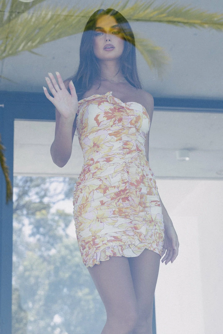 Hey dream girl, meet the Tropicana Strapless Mini Dress! This stunning piece features a strapless sweetheart neckline with an asymmetrical ruffle trim down the front and a ruched bodice for a flattering silhouette. Available in pink, yellow, and orange. Pair with some chic heels to complete the look.