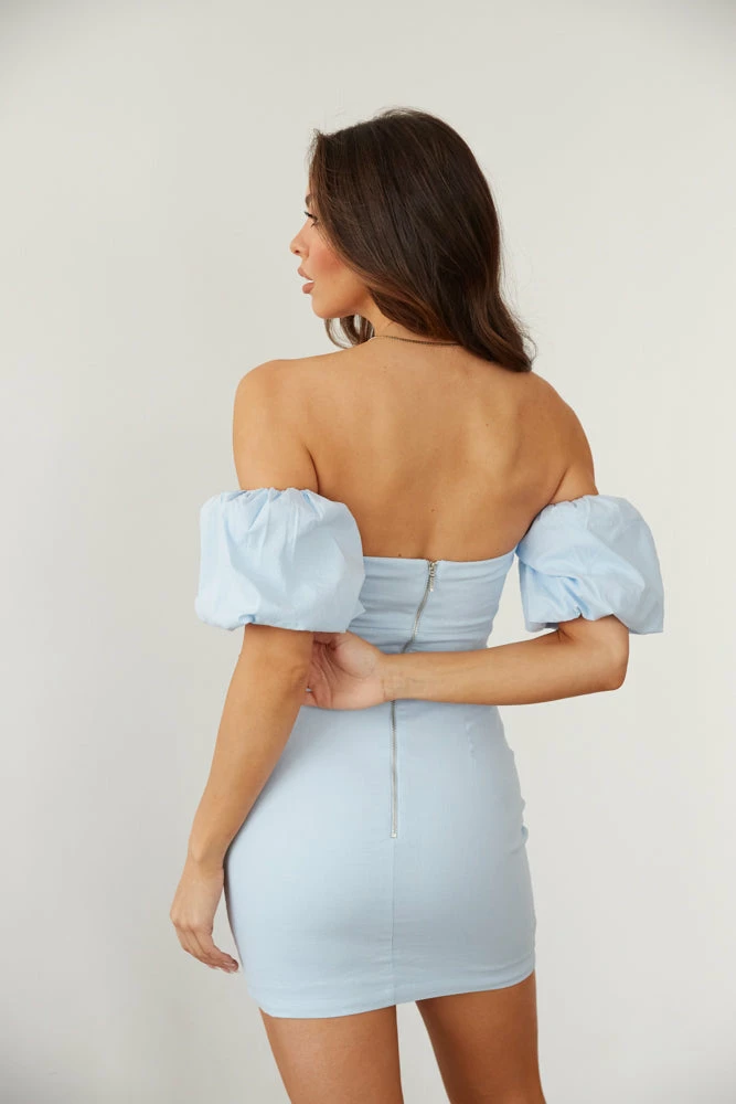 Breaking hearts in the Ximena Mini Dress! This stunning piece features a bow sweetheart neckline, a front keyhole detail, off the shoulder puff sleeves, and boning for a structured silhouette. Also available in pink. Pair with the Ukari Clear Block Heel for an elegant modern look!