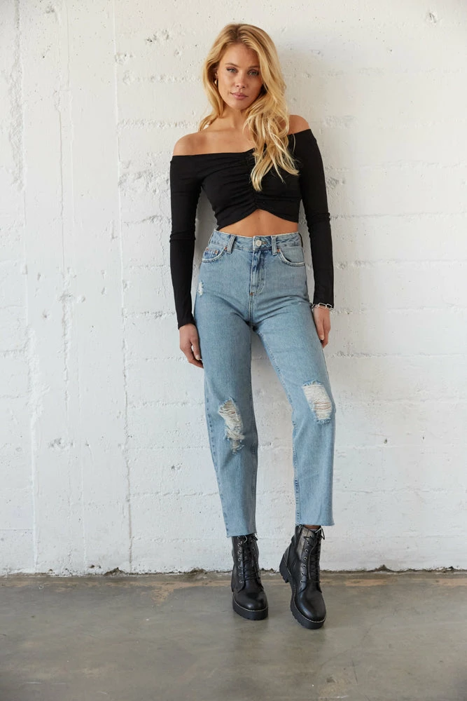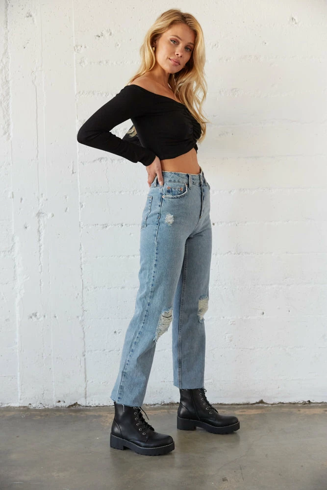 The Pax Destroyed Jeans In Medium Wash by BDG are for the denim dreamers! These essential jeans are complete with a relaxed straight silhouette, distressed detailing throughout, and a high rise fit. Available in a medium wash blue denim. Style with our Jasmine Ribbed Cinch Crop Top for an effortless everyday look.Â