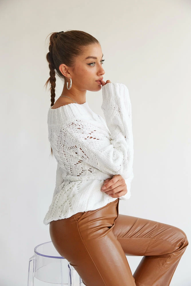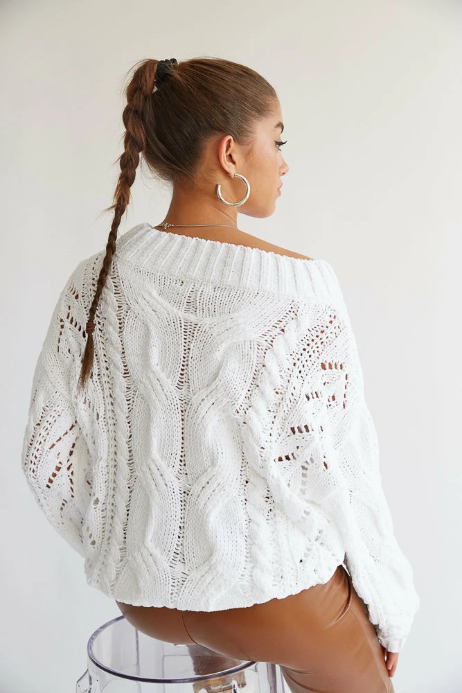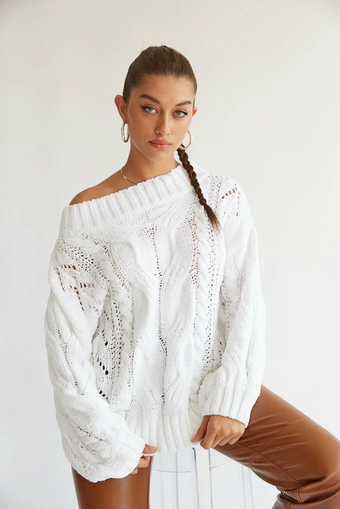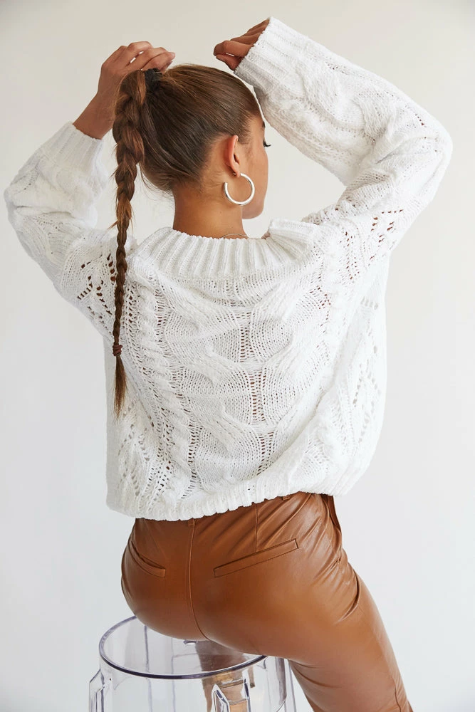 Hey babe, the Faith Cable Knit Sweater is the ultimate wardrobe staple! This chunky knitted sweater is complete with a mock neckline and an ultra soft relaxed silhouette. Available in white. Pair with leather pants for the ultimate fall ready look!