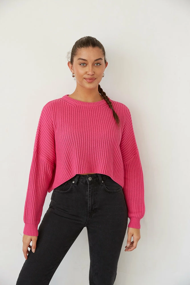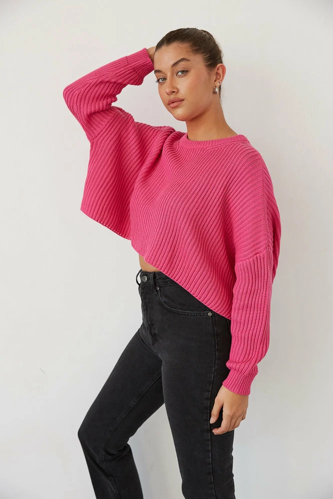 Add a pop of color to your wardrobe with the Josie Crop Knit Sweater! This cozy top is complete with a crew neckline, dropped sleeves for a relaxed fit, and a soft crochet knit design. Available in hot pink. Keep it funky with the Jax Wavy Straight Leg Jeans!