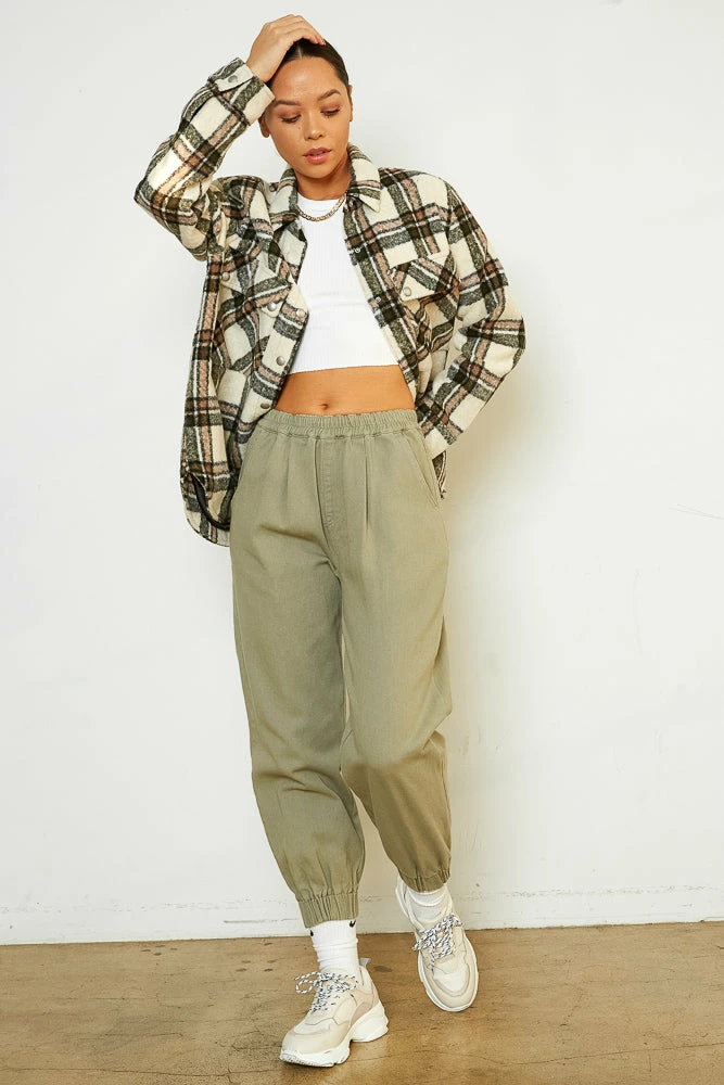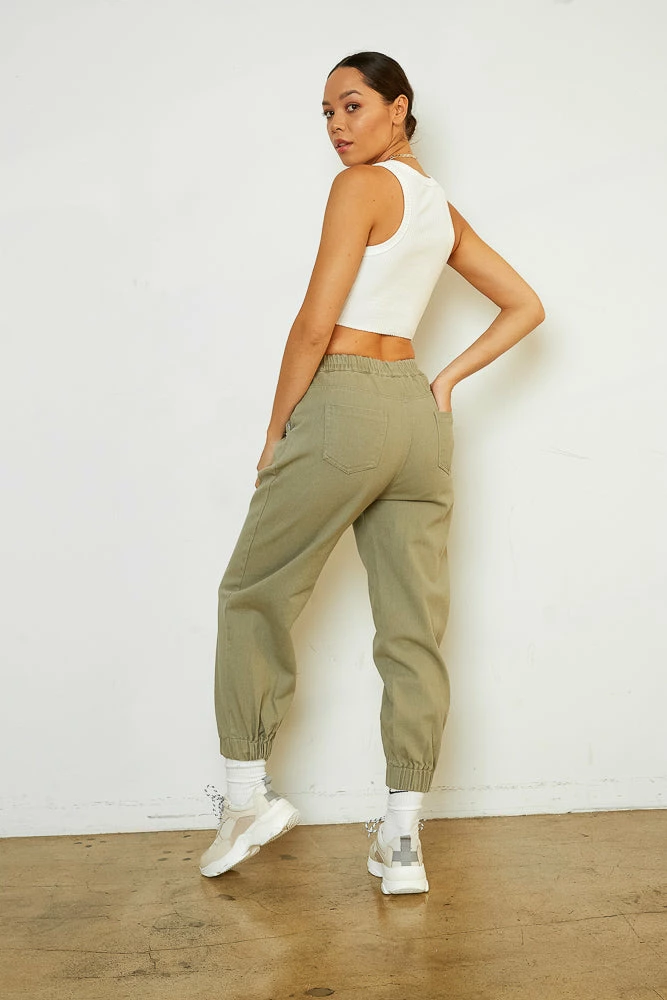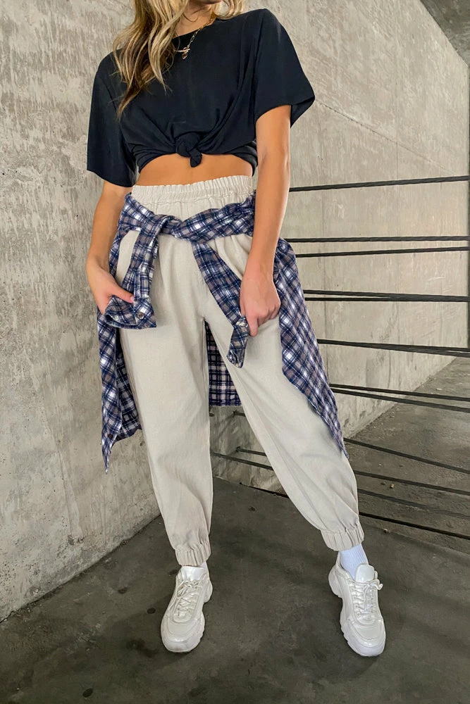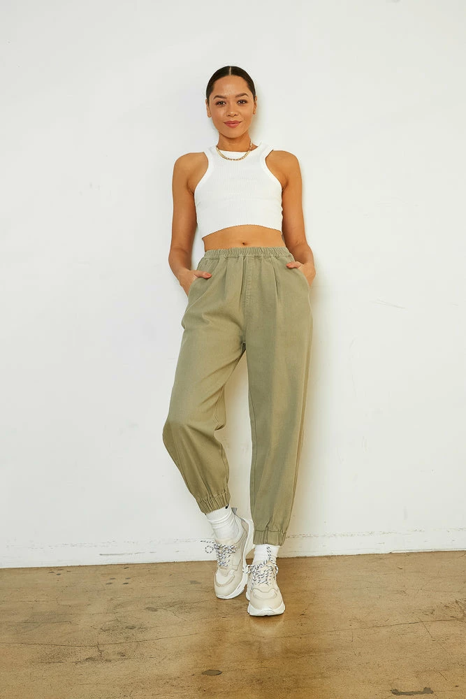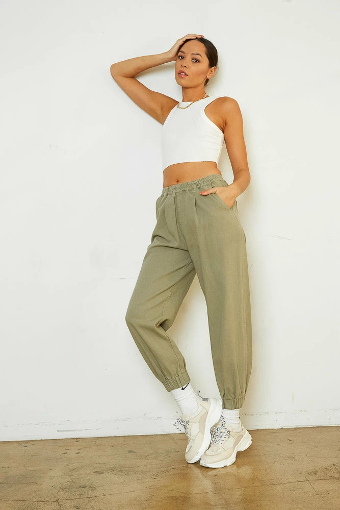 The She’s A Natural Jogger Pants will be your new staple! Complete with a high rise fit, a relaxed jogger silhouette, and a denim-like fabric. Available in oat and olive. Get ready to rock these pants anywhere you go! Top it off with the She Can Hang Muscle Tee to complete this model-off-duty vibe.