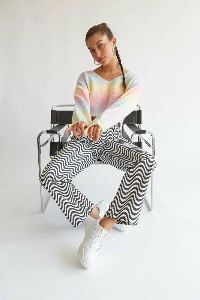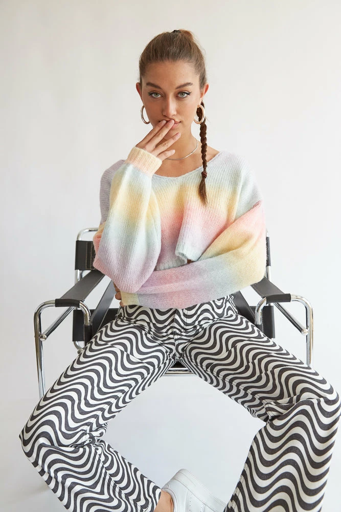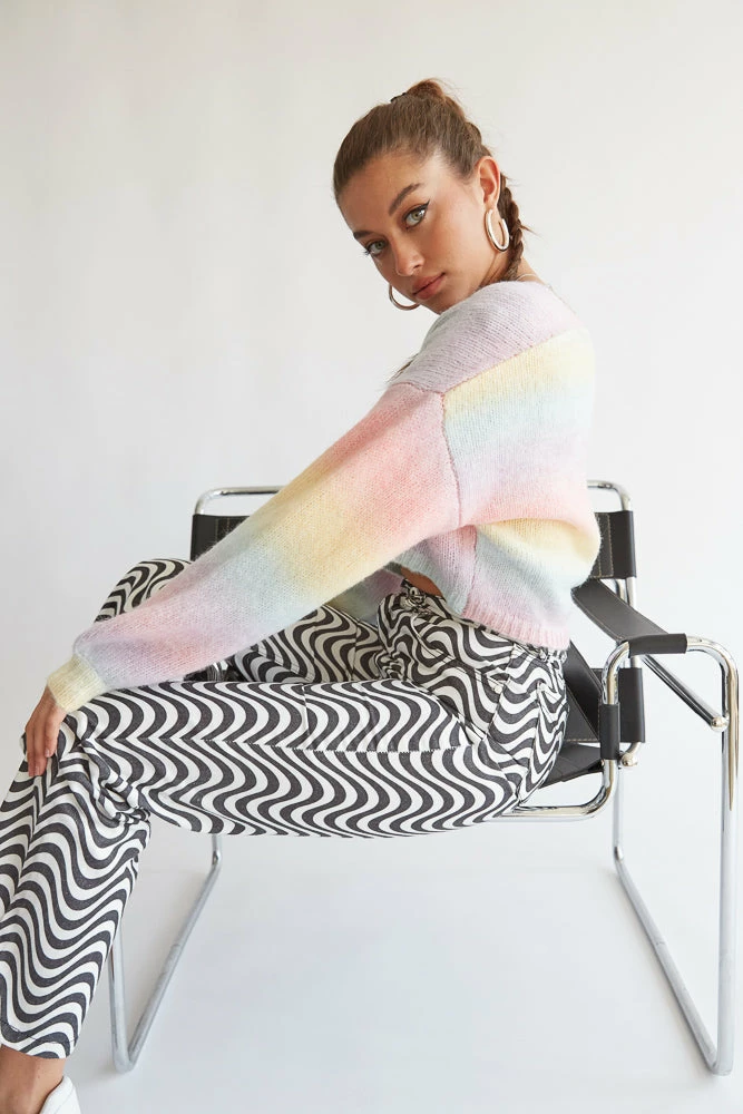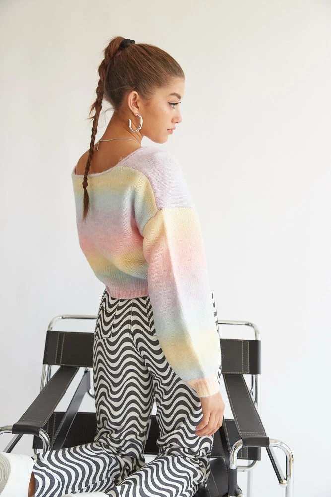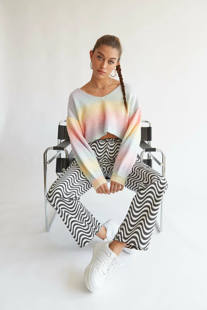 Hey cutie, meet the Sheridan Knit Crop Sweater! This cozy piece features a v neckline, dropped shoulders for a casual fit and a soft knit design. Available in rainbow multicolor. Wow everyone with this statement piece by adding a pair of fun pants with it!Â