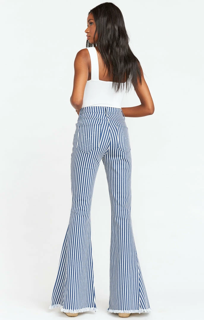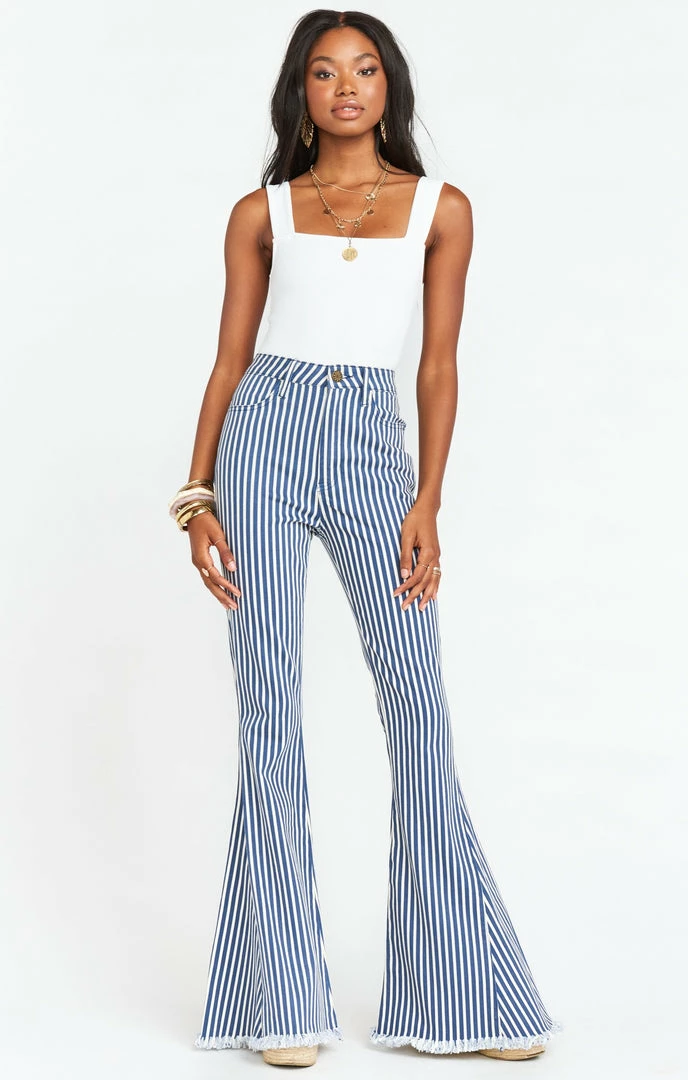 The Berkeley Zip Up Bells are the perfect pair of denim bell bottoms, they are high waisted, super flared, and flattering for all! These boho bell bottoms provide a polished and fitted look and feature a playful stripe. Pair with our Native Daughters Delaney Crop Top to complete a look perfect for any day of the week! Available in a navy and white striped design. By Show Me Your Mumu.Â