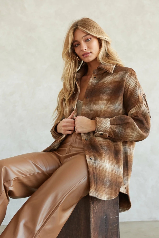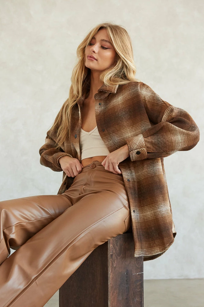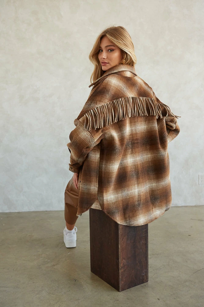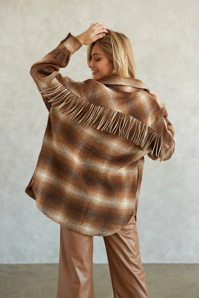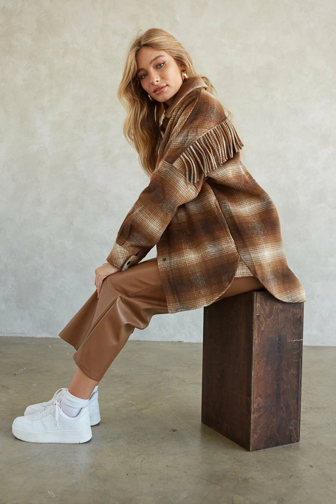 Cuddle up in the Cooper Plaid Fringe Shacket by Steve Madden! This cozy wardrobe staple is complete with a snap button up front, a soft boxy wool silhouette, and fringe detailing along the back for an edgy touch. Available in brown. Pair with vegan leather pants for a fierce look!