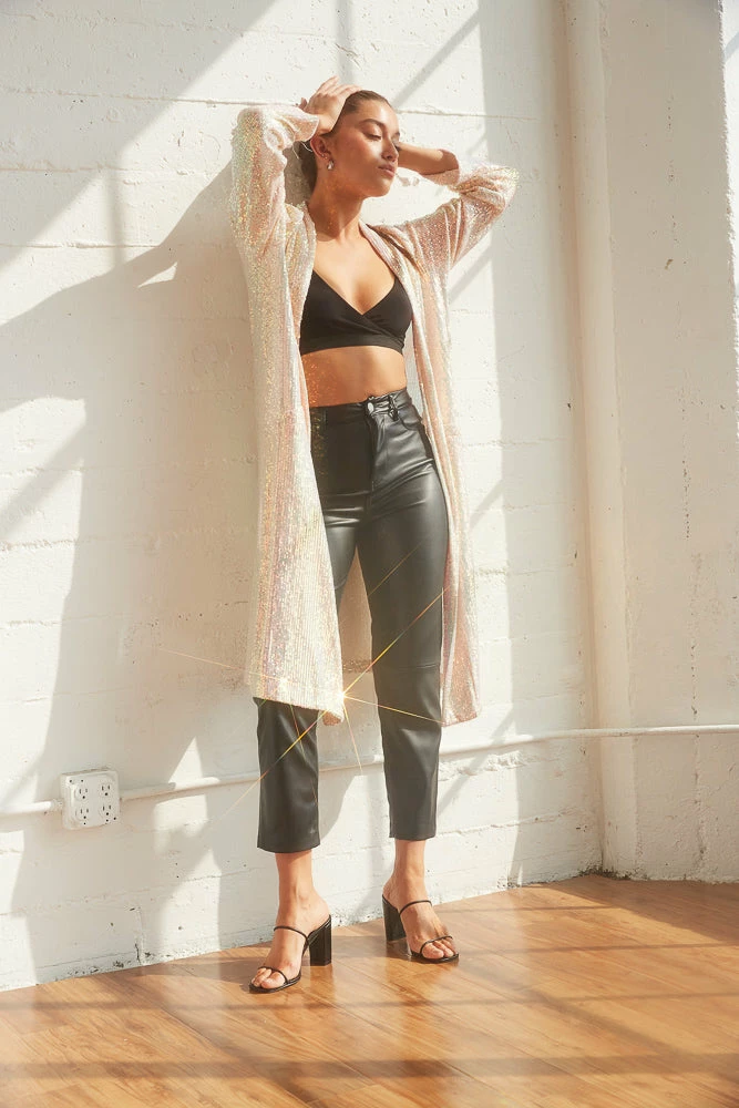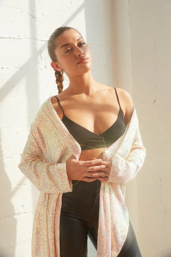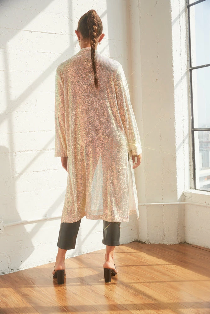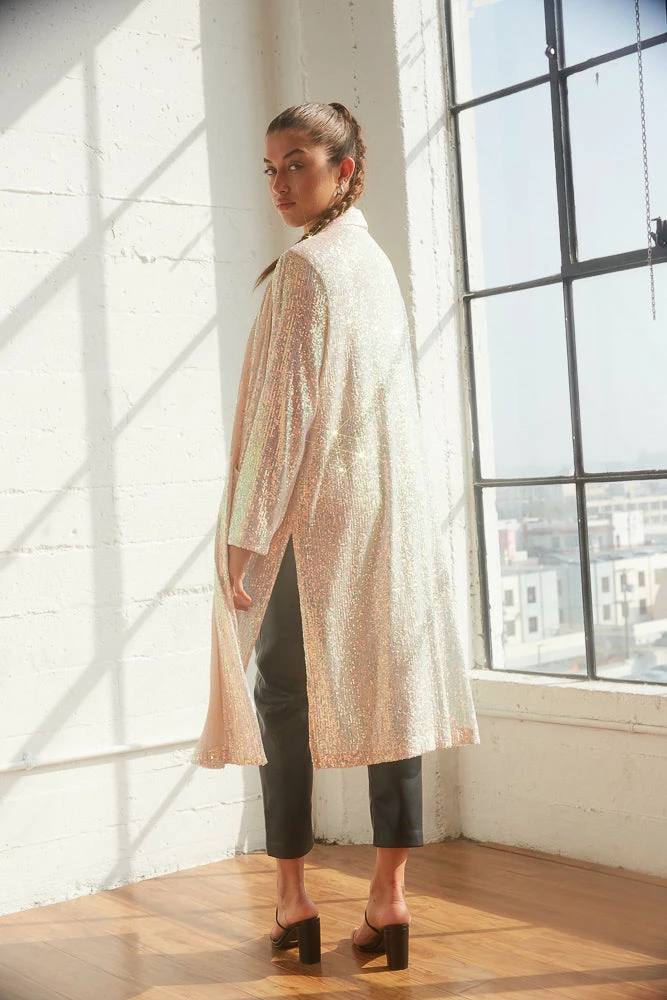 Jaws will drop when you’re in the Sterling Sequin Duster Jacket by Steve Madden! This statement coat is complete with a cardigan open front, two side slit details, and a shiny sequin bodice. Available in iridescent pink. Pair with a hot little dress for a festive vibe!