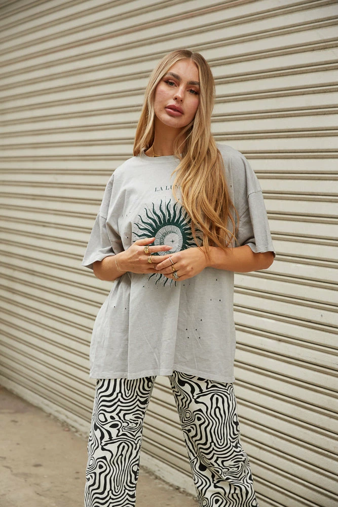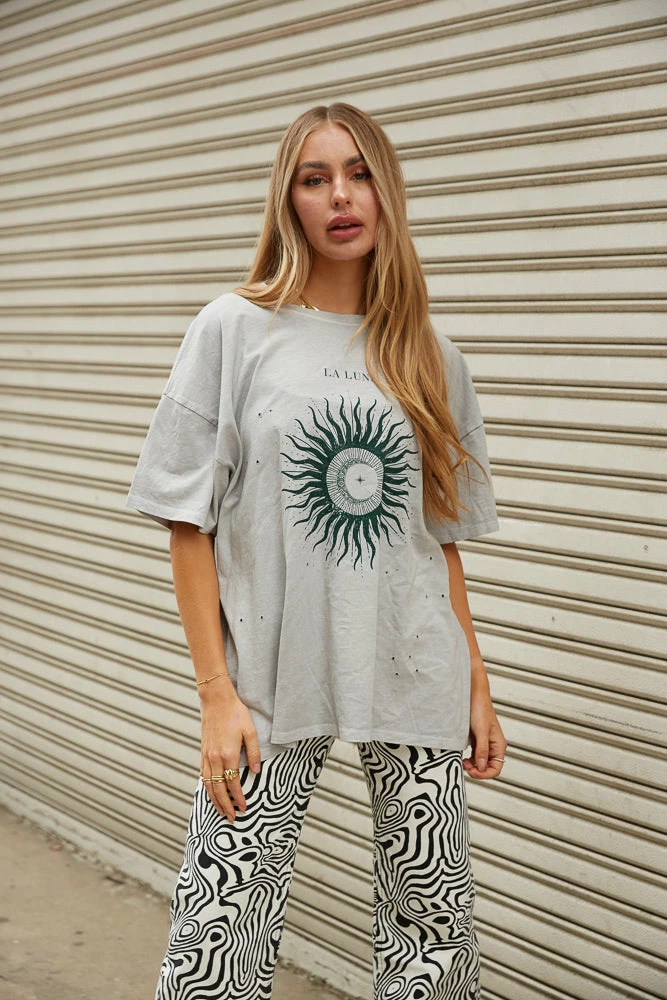 Hey babe! The La Luna Oversized Tee by Sunday Skin is an absolute gem. This graphic t-shirt features an oversized fit, a boxy silhouette, distressed detailing, and a golden celestial graphic on the front. Available in vintage washed light grey. Style this perfect graphic tee with the Rolla’s Dusters Short In Layla Bleach for an effortlessly cool vibe.