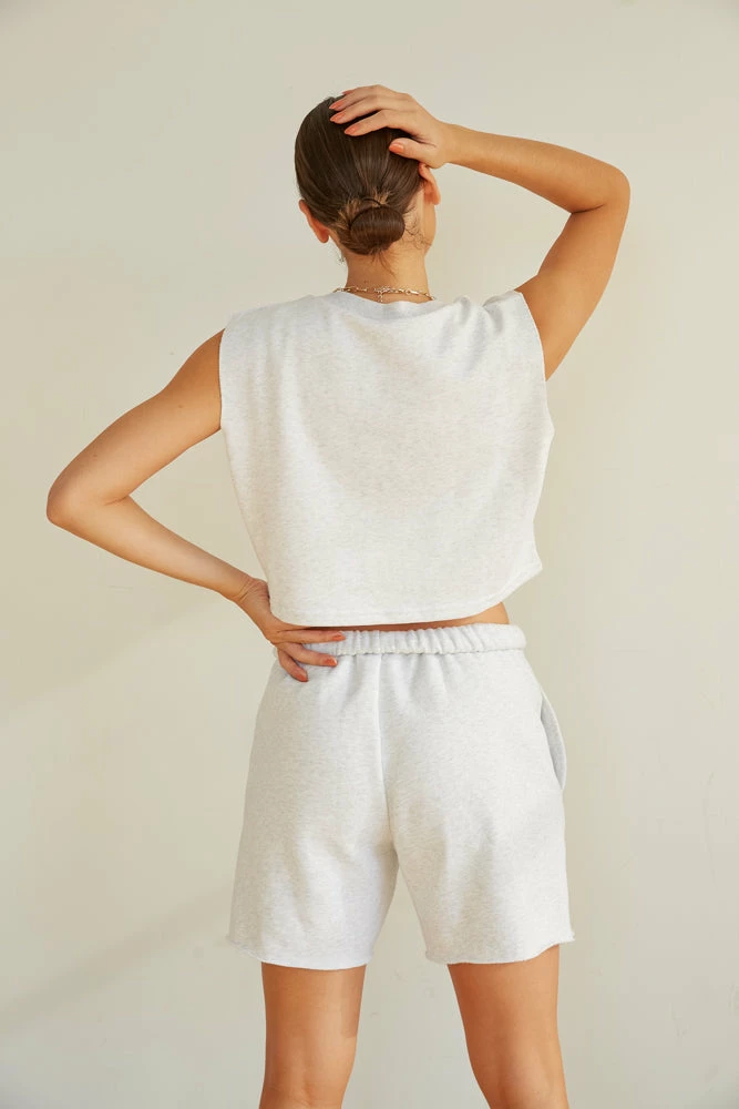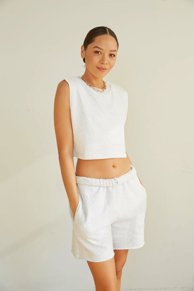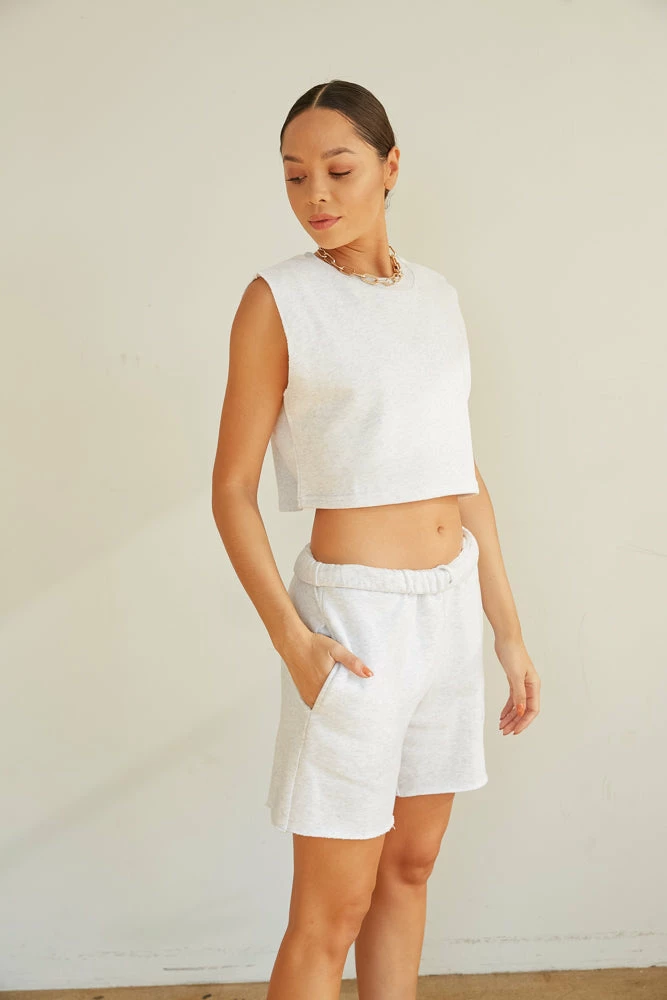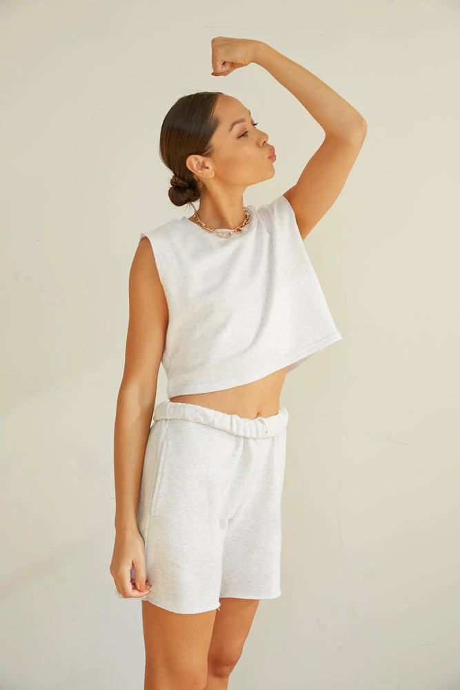 Start making moves in the Sunday Skin Electric Muscle Tee! This piece is complete with a boxy cropped silhouette, a sweatshirt like fabric, and raw edge armholes. Available in cloud grey. Pair with our Sunday Skin ’90s Baggy Sweatpants In Cloud Grey to make this look a set!