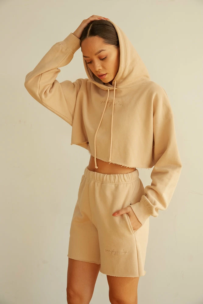The wait is over. Your perfect fall sweatshirt just landed! The Girlfriend Crop Hoodie by Sunday Skin features a boxy cropped silhouette, slouchy sleeves, and a drawstring tie. Topped off with a beautiful “Sunday Skin” monochromatic embroidered logo. Available in tan. Style with our Sunday Skin ’90s Baggy Sweatpants In Tan to make this look a set!Â