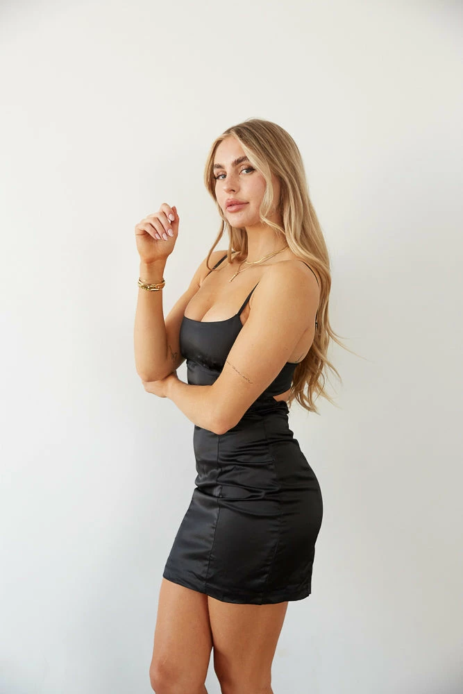 Drooling over this hot little black dress! The Tatiana Satin Mini Dress is complete with a scoop neckline, an under bust lining detail for a bustier look, and a silky bodycon silhouette. Available in black. Step into the Agency Black Western Boots for an elevated look!