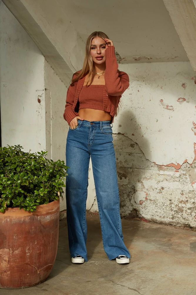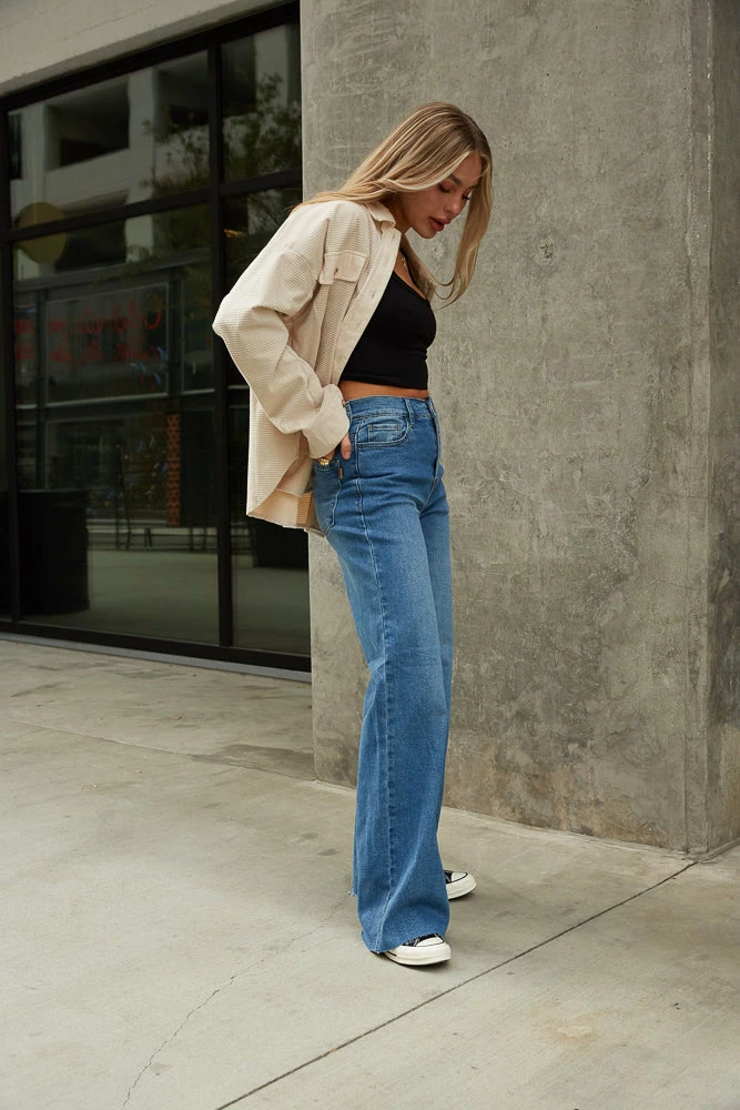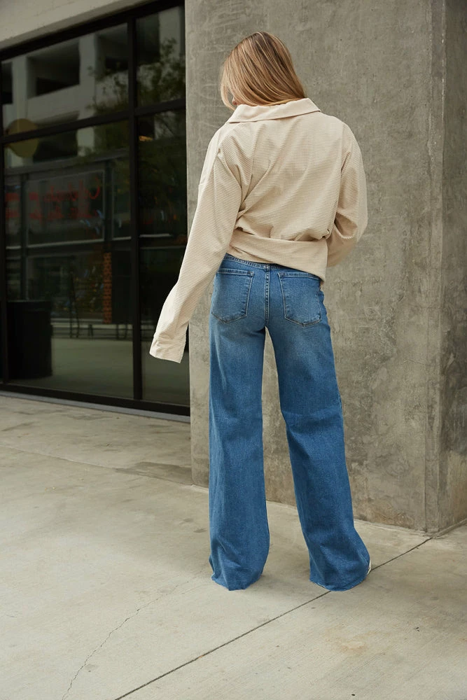 Hey babe, meet your new favorite pair of jeans! The Riverside Wide Leg Jeans are complete with a high rise fit, a relaxed wide leg, and a raw hem. Available in blue wash denim. Pair with the Kian Waffle Button Up Top to complete the full look!